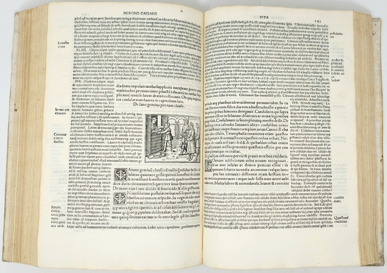 Prima edizione illustrata dello Svetonio, sotto il titolo legno ombreggiato (mm. 86 x 128) col monogramma L raffigurante un maestro in cattedra e quattro discepoli (già utilizzato, con altra figura del personaggio dell'autore, per l'Orazio del 1505). Nel testo 80 splendide vignette in silografia delle quali 44 al tratto, improntate quasi tutte ad una precedente edizione del Tito Livio, e 36 vignette ombreggiate, fatte espressamente per quest'edizione. Sul f. 1, all'inizio del testo, vignetta raffigurante la nascita di Giulio Cesare: si tratta della prima raffigurazione di un parto Cesareo. La stessa incisione riappare nel capitolo riguardante Giulio Cesare. Superba edizione figurata, che sarà ristampata da Filippo Pincio nel 1510. Esemplare molto bello e puro, con le silografie assai nitidamente impresse (antico timbro al titolo). Essling 208. Sander 7143. STC 651.
