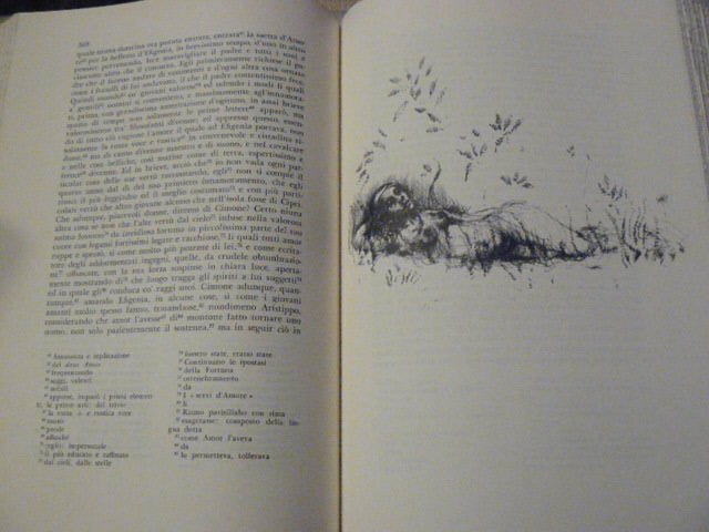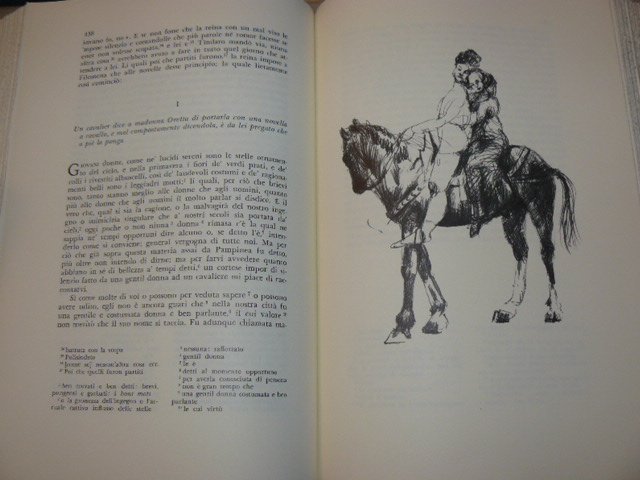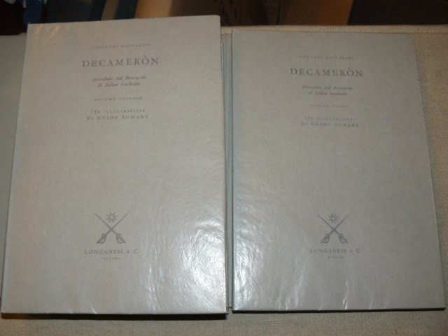 In-8° (23x16 cm.), pp. 293; 778 (20), 124 illustrazioni originali di Guido Somarè, Prefazione di Giuseppe Prezzolini - Traduzione di Ginetta Vittorini, elegante brossura protetta da velina, in custodia cartonata senza cofanetto. 'Questa nuova edizione del Decameròn vuole soltanto offrire un testo accompagnato da squisite illustrazioni e da note intese a agevolarne le lettura: Anche la biografia del Boccaccio che precede le novelle serve a questo scopo: avvicinare finalmente la figura umana dello scrittore al pubblico moderno'.Collezione ' I Marmi' n. 57-58. Ottimo esemplare