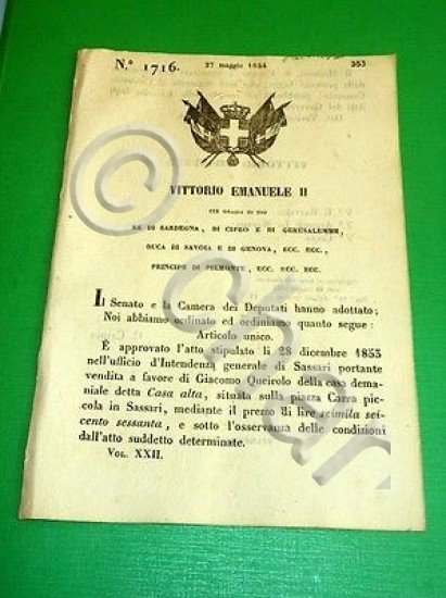 *** Atti del Governo di S. M. il Re di Sardegna: "Legge , colla quale si approva la vendita fatta a favore di Giacomo Queirolo della casa demaniale detta Casa Alta situata sulla piazza Carra Piccola in Sassari ..."Torino, 27 Maggio 1854. Pagine 2.Per appassionati studiosi e collezionisti