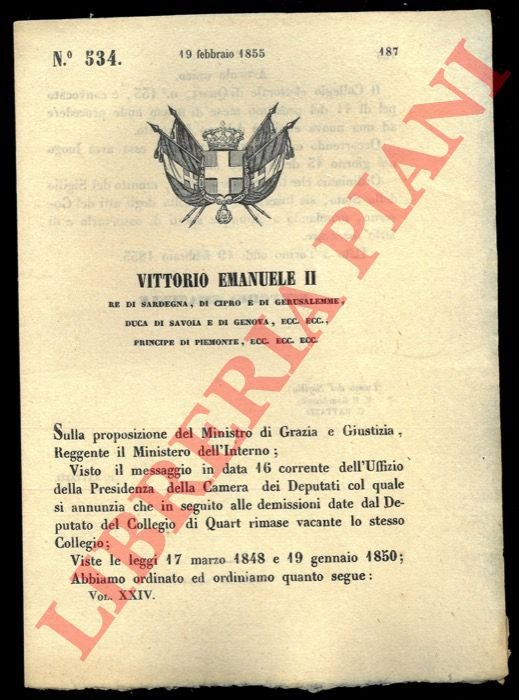 Torino nella Reale Stamperia, 1855, febbraio 19, a firma Vittorio Emanuele II, U.Ratazzi, pp. 4
