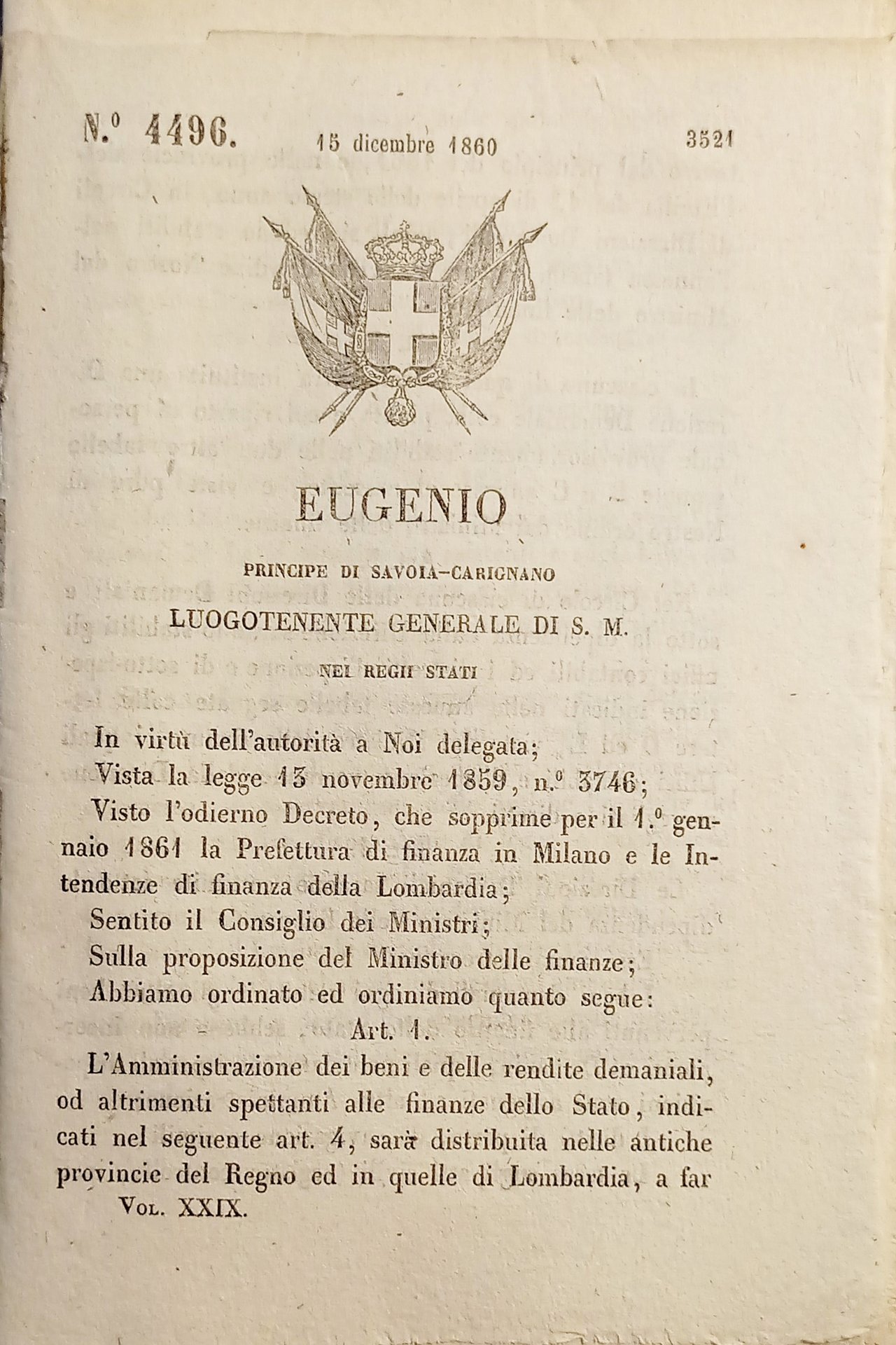 Decreto Eugenio - L'Amministrazione dei beni e delle rendite demaniali sarà distribuita nelle antiche province del Regno ed quelli di Lombardia - 1860  Decreto â 4496  Pagine 66  Condizioni buone come da foto.  Â