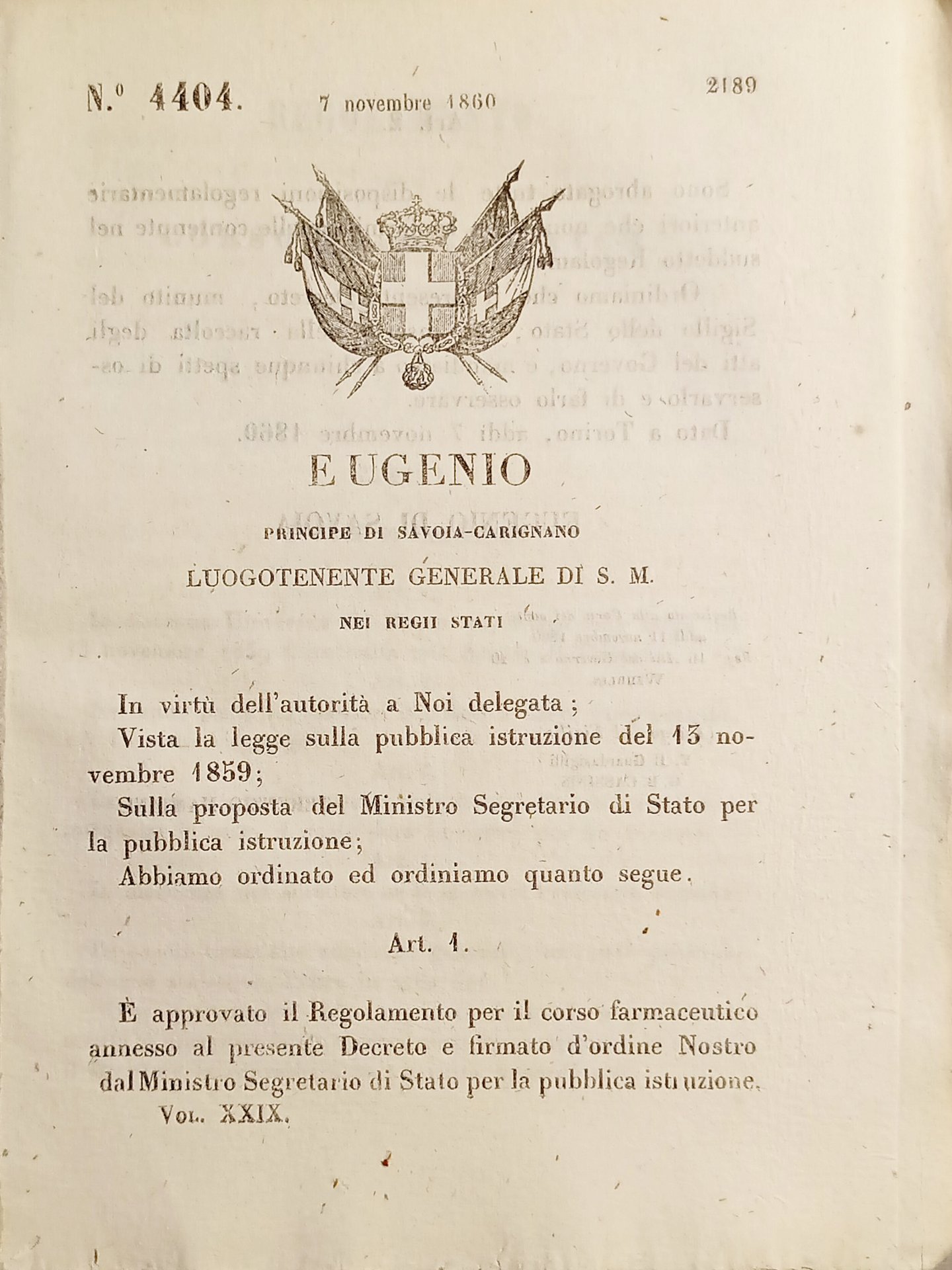 Decreto Eugenio - È approvato il Regolamento per il corso farmaceutico - 1860