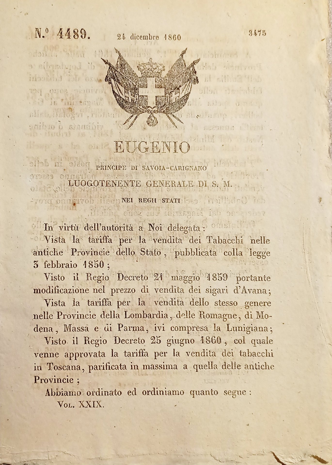 Decreto Eugenio - Qualità , il peso ed il prezzo dei Tabacchi nelle antiche Province dello Stato, ed in quelle di Lombardia e dell'Emilia - 1860  Decreto â 4489  Pagine 6  Condizioni buone come da foto.  Â
