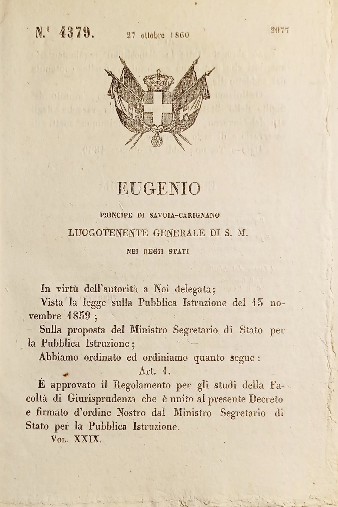 Decreto Eugenio - Regolamento per gli studi della Facoltà di Giurisprudenza 1860