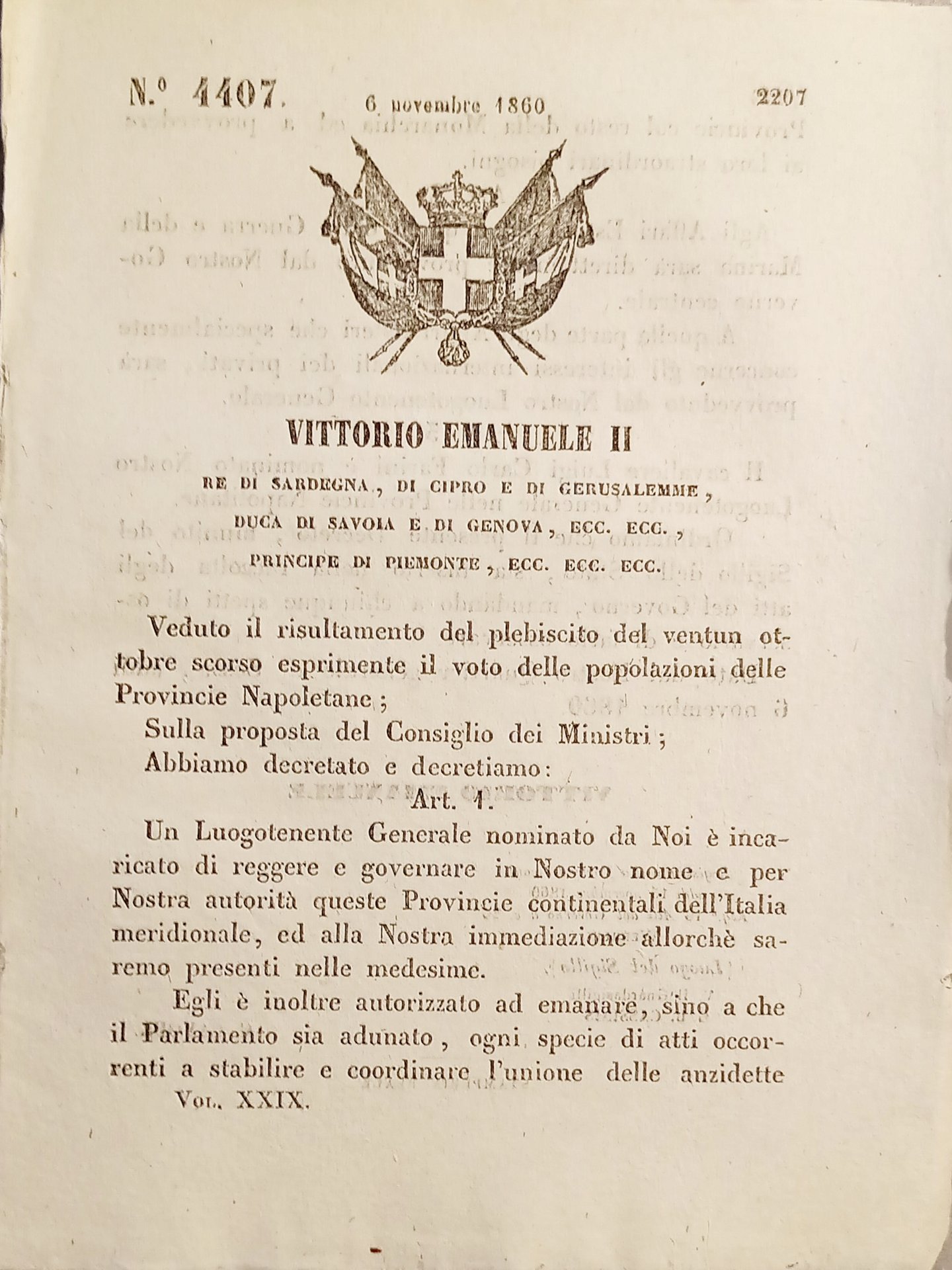 Decreto Eugenio - Un Luogotenente Generale nominato da Noi è incaricato di reggere e governare in Nostro nome - 1860  Decreto â 4407  Pagine 2  Condizioni buone come da foto.  Â