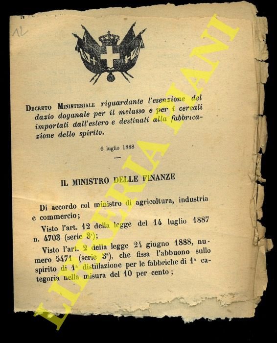 Decreto Ministeriale riguardante le'senzione del dazio doganale per il melasso e per i cereali importati dall'estero e destinati alla fabbricazione dello spirito.
