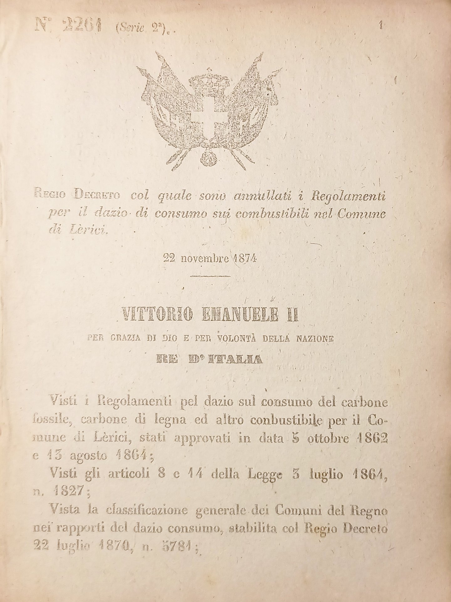 Decreto Regno d'Italia - Regio Decreto col quale sono annullati i Regolamenti per il dazio di consumo sui combustibili nel Comune di Lèrici - 22 Novembre 1874  Decreto â 2261  Pagine 2  Condizioni buone come da foto