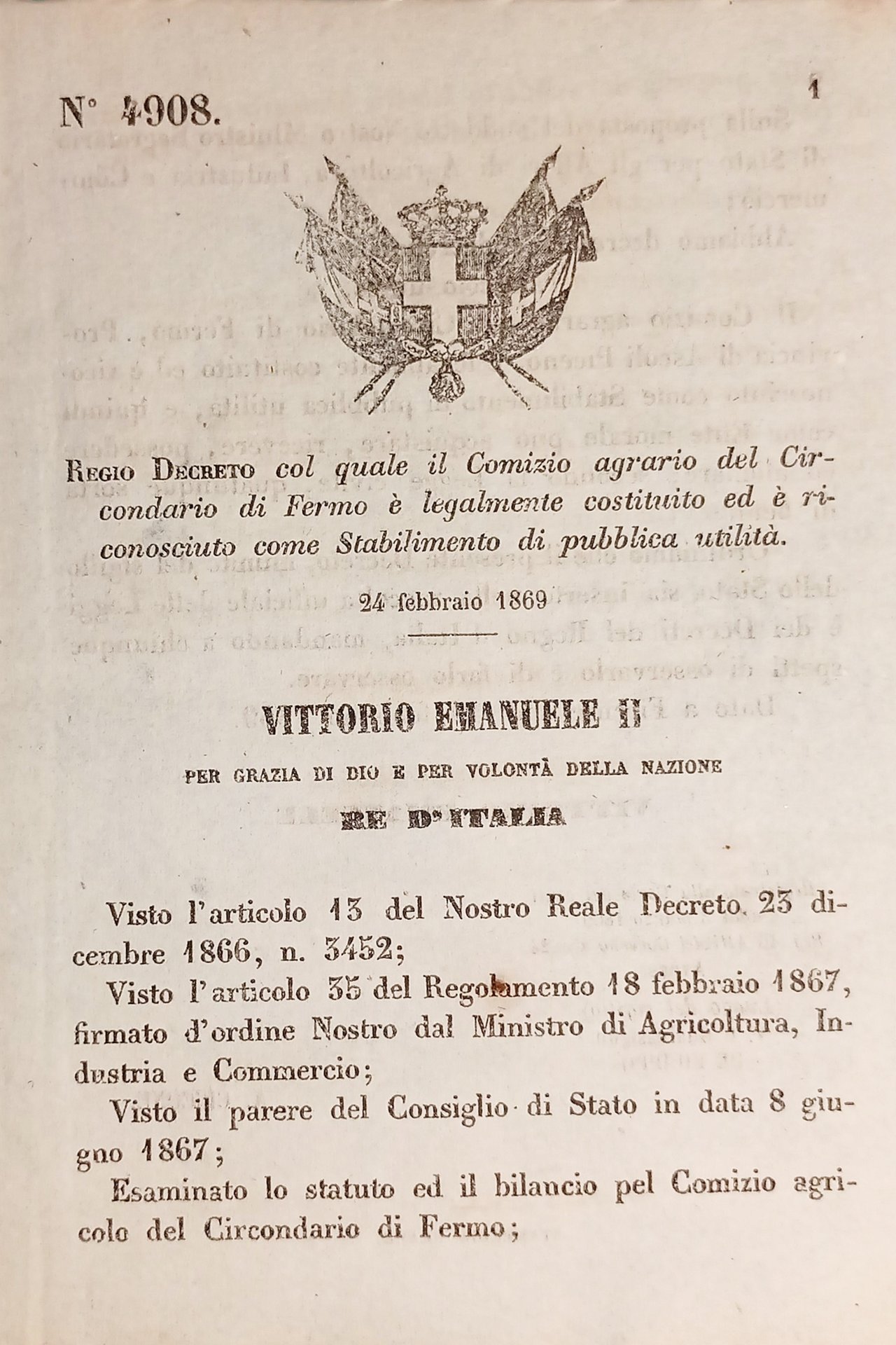 Regio Decreto col quale il Comizio agrario del Circondario di Fermo è legalmente costituito ed è riconosciuto come Stabilimento di pubblica utilità - 1869  Decreto â 4908  Pagine 2  Condizioni buone come da foto