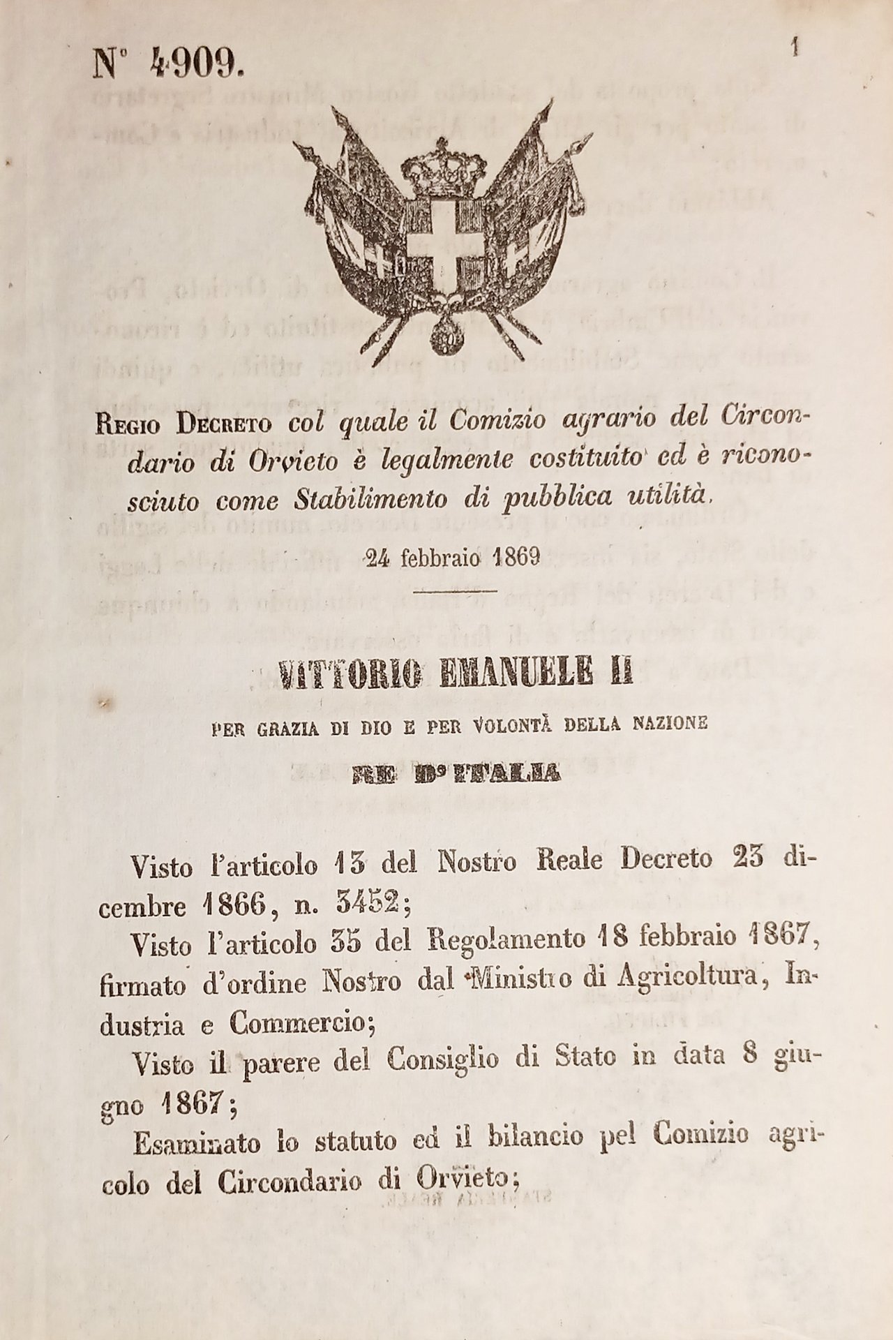 Regio Decreto col quale il Comizio agrario del Circondario di Orvieto è legalmente costituito ed è riconosciuto come Stabilimento di pubblica utilità - 1869  Decreto â 4909  Pagine 2  Condizioni buone come da foto