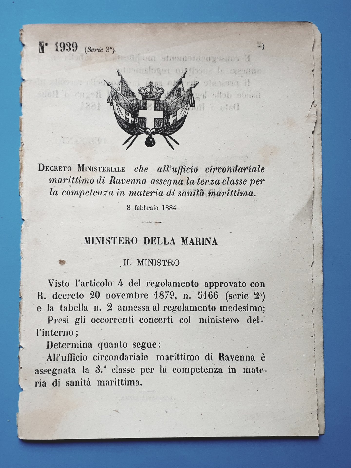 Regio Decreto che all'ufficio circondariale marittimo di Ravenna assegna la terza classe per la competenza in materia di sanità marittima. 8 febbraio 1884 Pagine 2 Decreto â 1939 Condizioni buone come da foto
