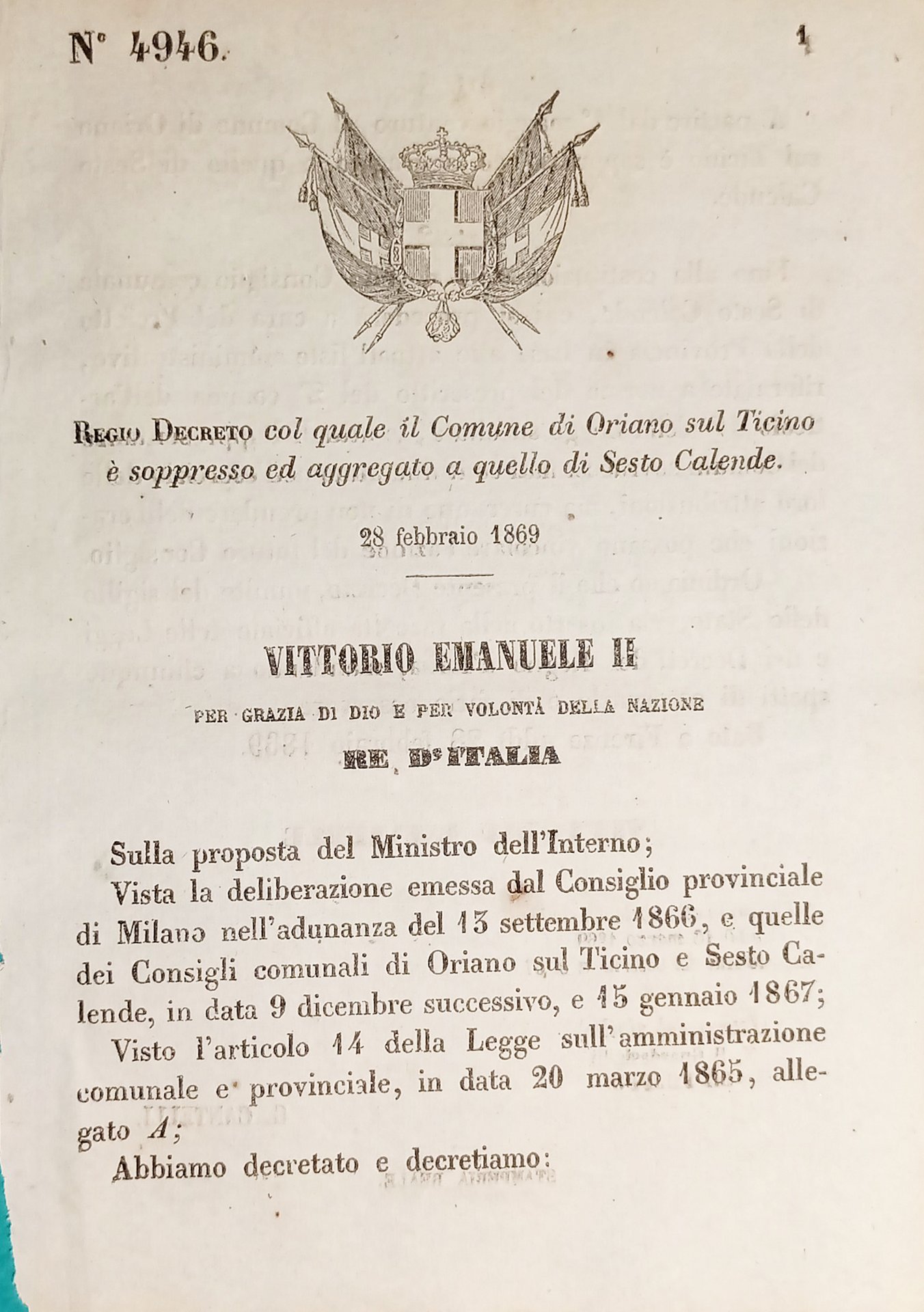 Regio Decreto col quale il Comune di Oriano sul Ticino è soppresso ed aggregato a quello di Sesto Calende - 1869  Decreto â 4946  Pagine 2  Condizioni buone come da foto