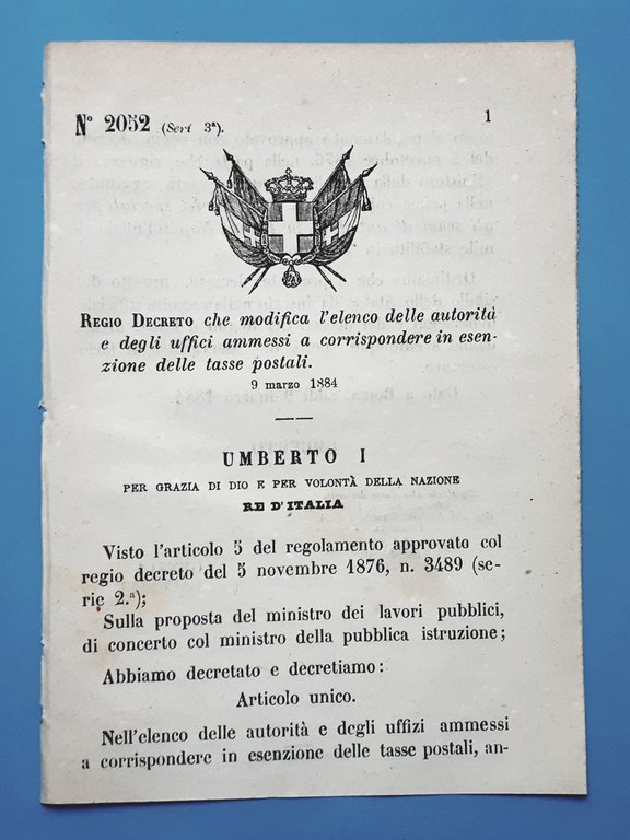 Regio Decreto che modifica l'elenco delle autorità e degli uffici ammessi a corrispondere in esenzione delle tasse postali. 9 marzo 1884 Pagine 2 Decreto â 2052 Condizioni buone come da foto