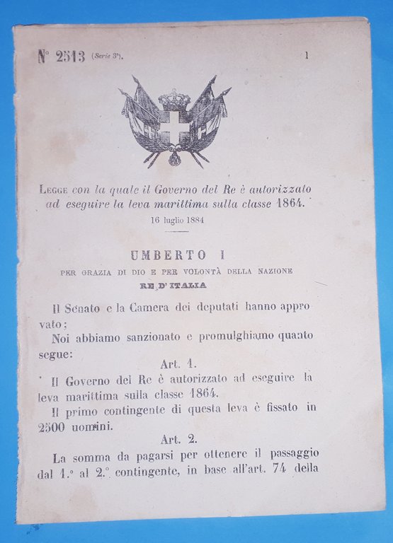 Legge con la quale il Governo del Re è autorizzato ad eseguire la leva marittima sulla classe 1864. Decreto â 2513 Pagine - 2 16 Luglio 1884 Condizioni buone come da foto Â