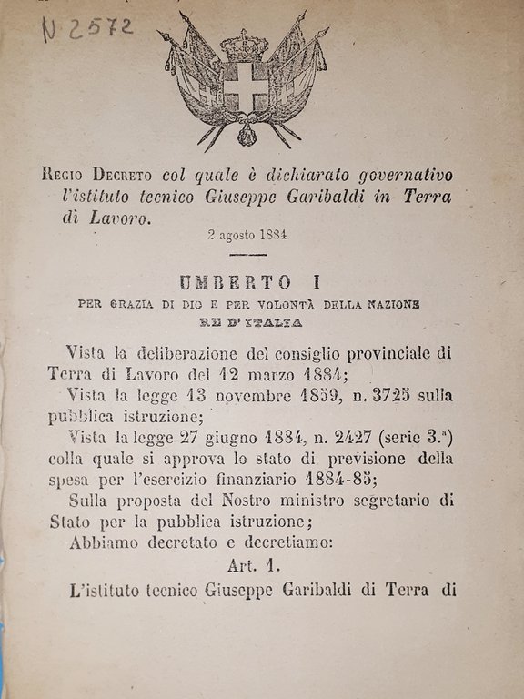 Regio Decreto col quale è dichiarato governativo l'istituto tecnico Giuseppe Garibaldi in Terra di Lavoro. Decreto â 2572 Pagine - 2 2 agosto 1884 Condizioni buone come da foto