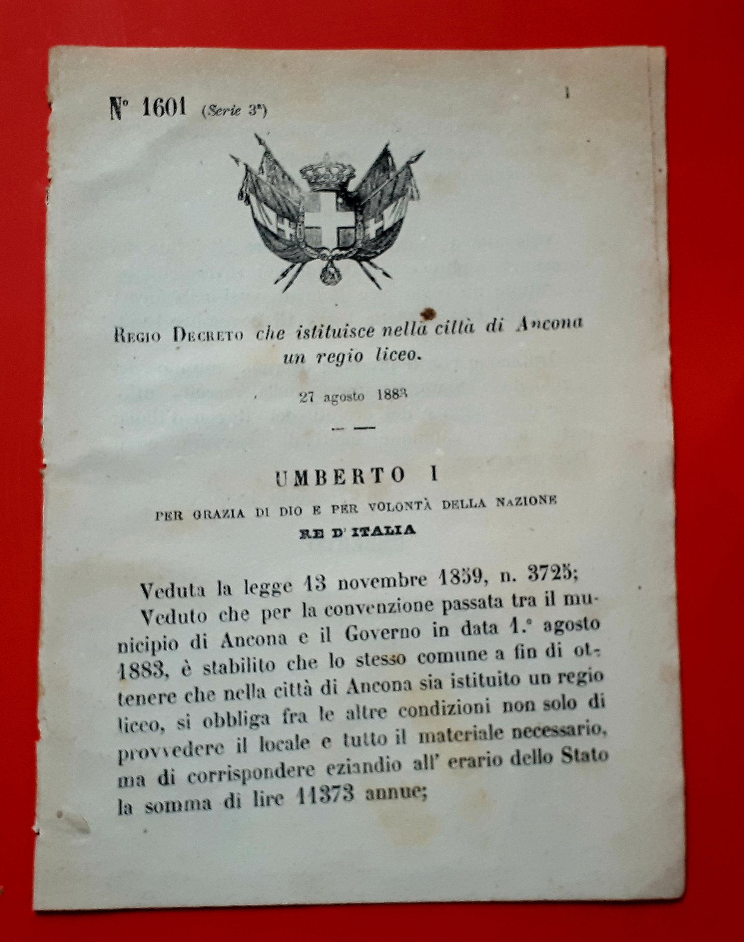 Decreto Regno Italia - Istituzione un regio liceo nella città di Ancona - 1883