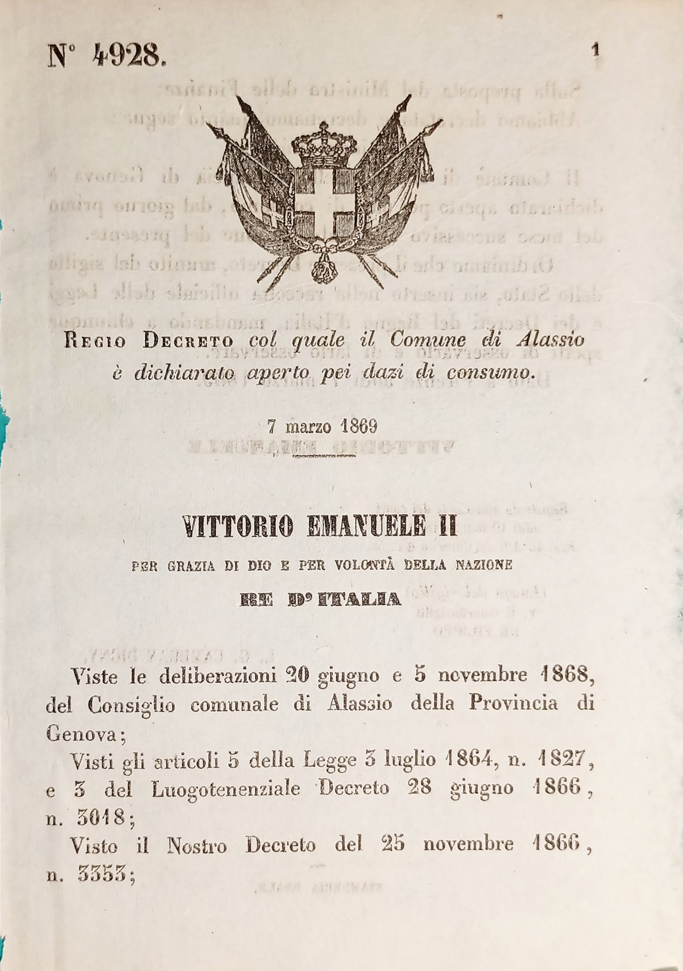 Decreto Regno Italia Comune di Alassio è dichiarato aperto pei dazi consumo 1869