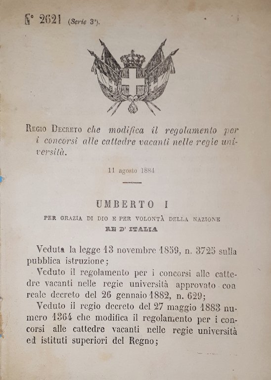 Regio Decreto che modifica il regolamento per i concorsi alle cattedre vacanti nelle regie università . Decreto â 2621 Pagine - 6 11 Agosto 1884 Condizioni buone come da foto