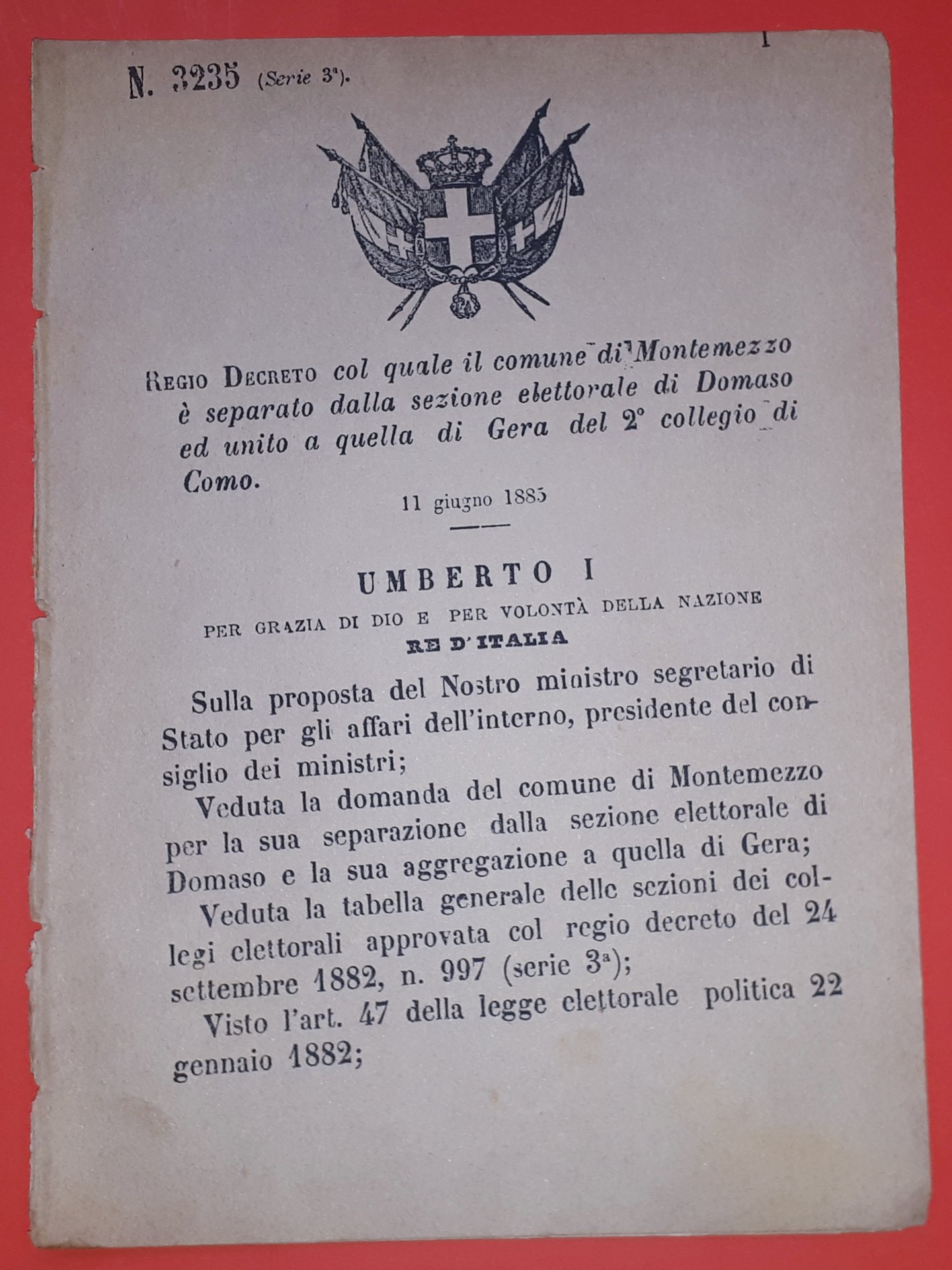 Regio Decreto col quale il comune di Montemezzo è separato dalla sezione elettorale di Domaso ed unito a quella di Gera del 2^ collegio di Como. 11 giugno 1885 Pagine 2. Decreto â 3235