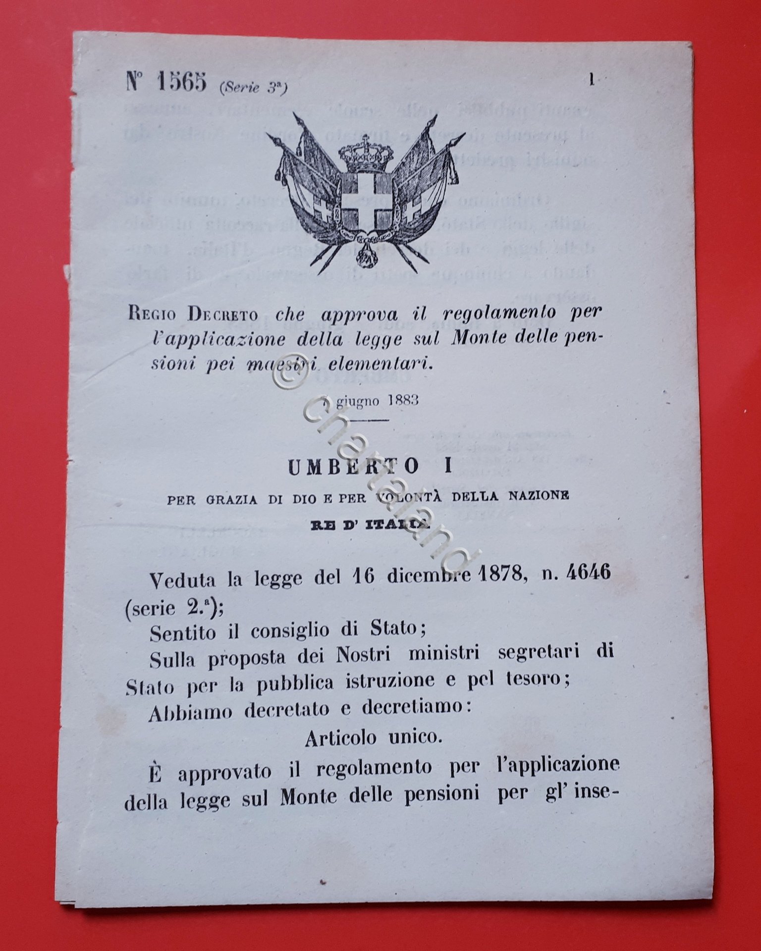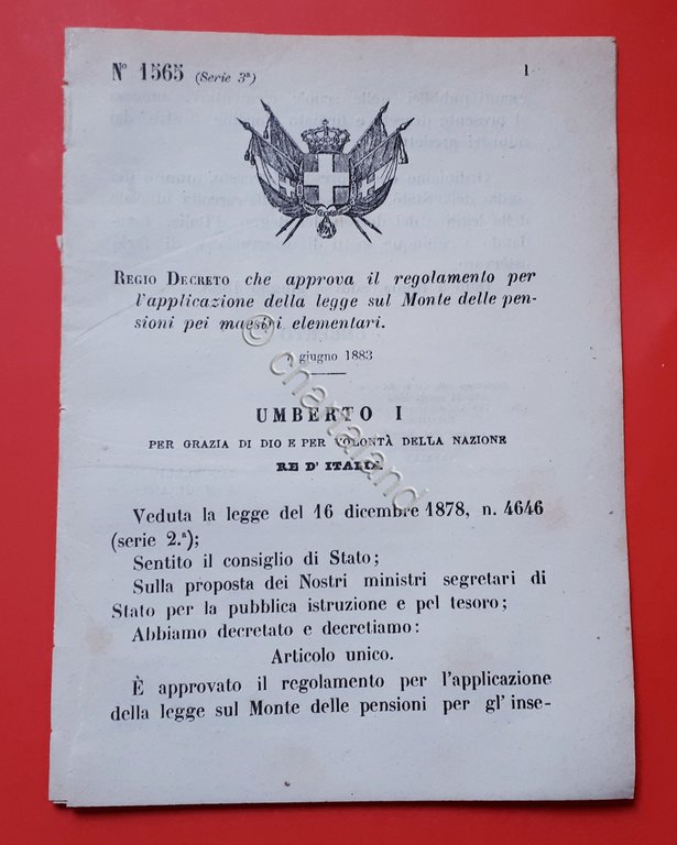 Regio Decreto che approva il regolamento per l'applicazione della legge sul Monte delle pensioni pei maestri elementari. 7 giugno 1883 Pagine 18. Decreto № 1565