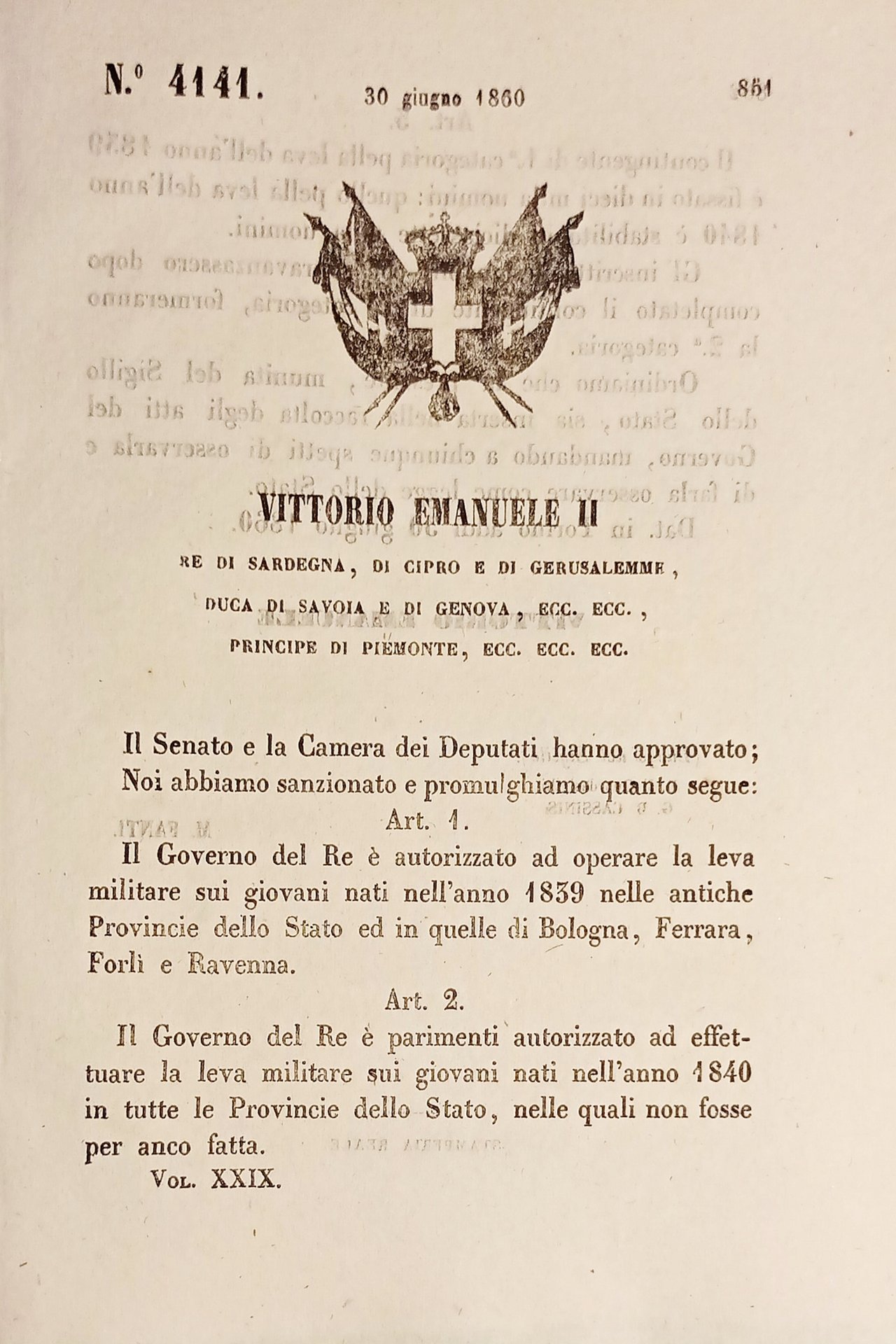 Decreto Regno Sardegna - Servizio di Leva nati nel 1839 per Provincie di Bologna Ferrara Forlì Ravenna e servizio di Leva nati nel 1840 in tutte le Provincie dello Stato 30 giugno 1860 Pagine 2 Decreto N. 4141