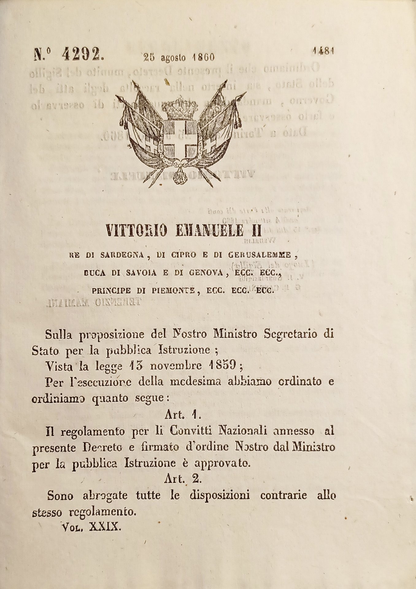 Decreto V. Emanuele II - Regolamento per i Convitti Nazionali è approvato - 1860