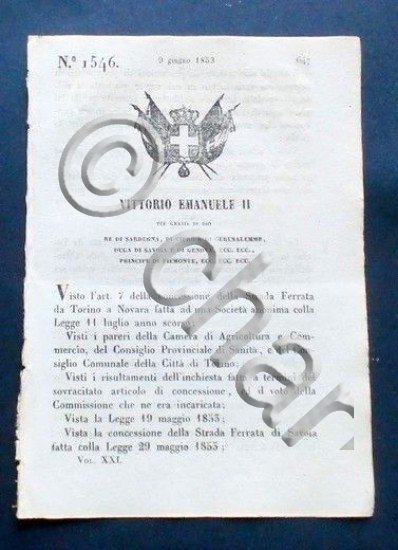 Decreto Vittorio Emanuele II - Via ferrata Stazione Torino Novara - 1853