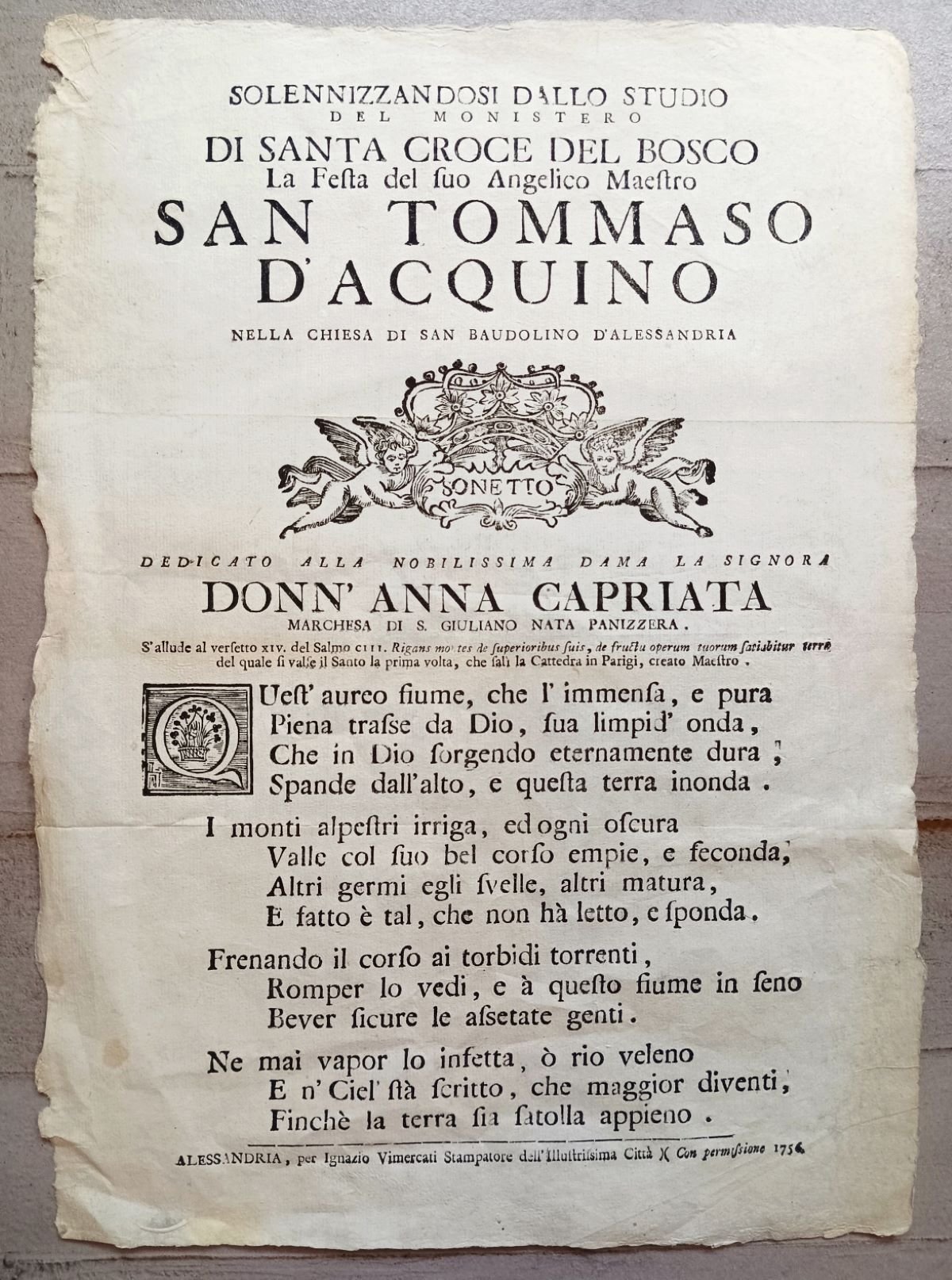 >Incisione (mm 405 x 295), carta vergellata, datata 1756; sonetto dedicato a Donn'Anna Capriata Marchesa di San Giuliano nata Panizzera, in occasione della festa di San Tommaso d'Acquino, maestro domenicano, nella chiesa di San Baudolino di Alessandria, "solennizzandosi dallo studio del monistero di Santa Croce del Bosco". SNel sonetto deddicato a Donn'Anna si allude al Salmo 103: «Rigans montes de superioribus suis – Colui che irriga i monti dalle sue alte dimore». Tommaso parte da un versetto del Salmo 103 e, attraverso un linguaggio metaforico, stabilisce una relazione tra le acque che, cadendo dal cielo, irrorano la terra per mezzo dei fiumi e le menti dei sapienti che sono irrigate dalla sapienza divina per nutrire le menti di coloro che ascoltano. In basso indicazioni tipografiche "Alessandria, per Ignazio Vimercati Stampatore dell'Illustrissima Città, Con Permissione 1756".Ampi margini, perfettamente conservata.
