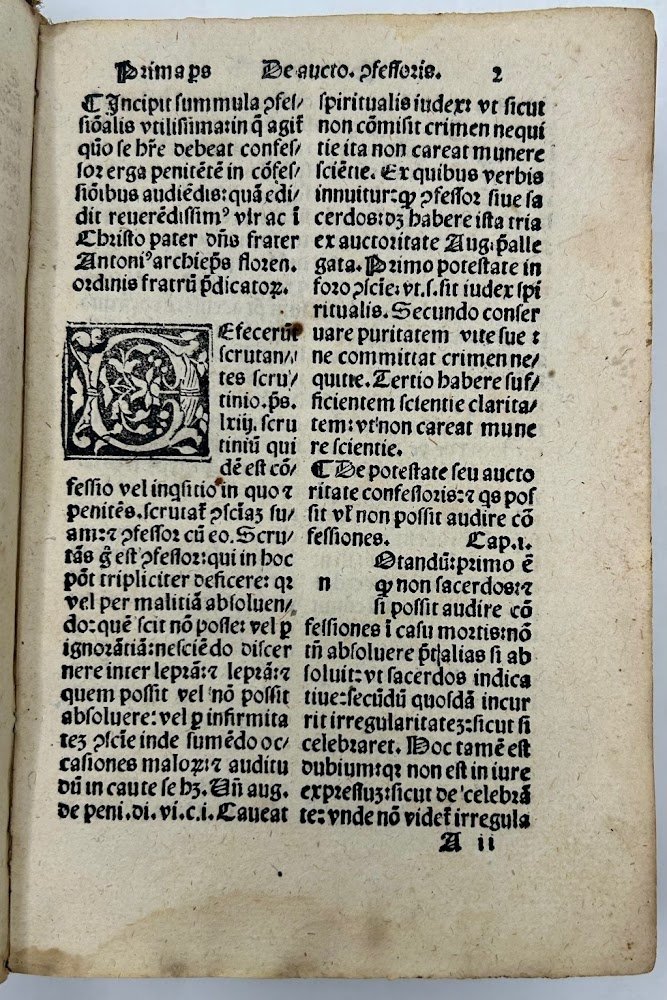 >in-8, (155 x 100mm.), ff. 184, (8), bella legatura coeva veneziana in piena pelle con duplice cornice vegetale e a filetti impressa a secco ai piatti con al centro nodi alla greca. Abili restauri al dorso e agli angoli. Alcuni aloni al margine inferiore delle prime pagine e tracce piuttosto sbiadite di firme manoscritte al foglio di titolo. Testo su due colonne stampato in carattere romano con alcuni capilettera xilografici e spazi con lettere guida. In fine, al contropiatto, un elenco manoscritto anticamente su 13 linee che riporta svariati rimedi vegetali e galenici. Antonino Pierozzi (1389-1459), noto anche come Antonino da Firenze, è stato un teologo e arcivescovo cattolico. Appartenne all'ordine dei frati predicatori e fu arcivescovo di Firenze e studioso nei ranghi della tarda scolastica. Tra le sue opere il "Defecerunt", prima parte del Confessionale, pur essendo un'opera minore ebbe notevole fortuna in quanto manuale pratico di confessione. Antonino fu proclamato santo da papa Adriano VI nel 1523, pochi anni dopo la presente edizione, stampata da Giovanni de Quarengi (Petrus de Quarengiis). Detto anche «Petrus Bergomensis», poichè originario della zona di Bergamo, iniziò la sua attività di stampatore a Venezia nel 1492 e continuò fino al 1517: l'Incunabula Short Title Catalogue riporta ben 61 sue edizioni con 479 esemplari segnalati nelle biblioteche di tutto il mondo.