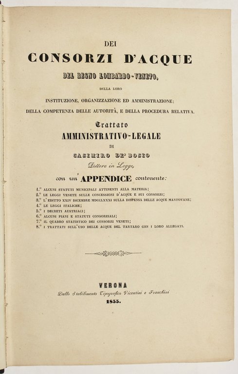 Dei consorzi d'acque del Regno Lombardo-veneto. Della loro istituzione, organizzazione ed amministrazione; della competenza delle autorità e della procedura relativa. Trattato amministrativo-legale.
