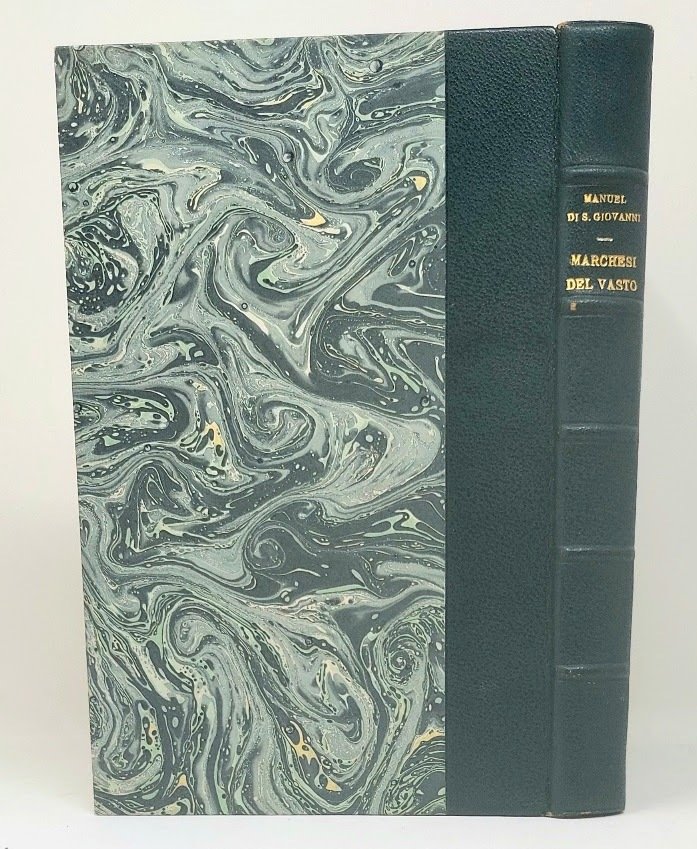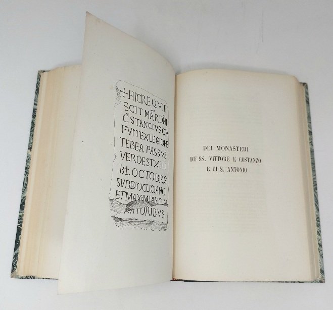 >in-8, pp. 380, (2), con 2 alberi genealogici ripiegati f.t., 1 tavola f.t. che riproduce un'iscrizione, 4 tavole f.t. in fine con pianta della Chiesa di San Costanzo presso Dronero, prospetti, sezioni e particolari dei suoi capitelli. Legatura d'amatore in m. marocchino verde, piatti marmorizzati, titolo in oro su dorso a nervi, broch. edit. conservata. Edizione originale, rara. Ottimo esemplare, con scritta di mano dell'A. "Rispettoso omaggio dell'autore" sul margine superiore della brossura originale. Manno V, 20283.