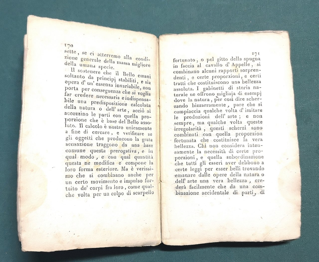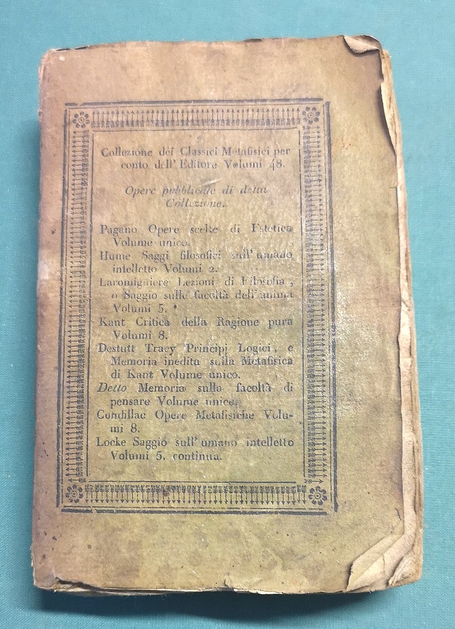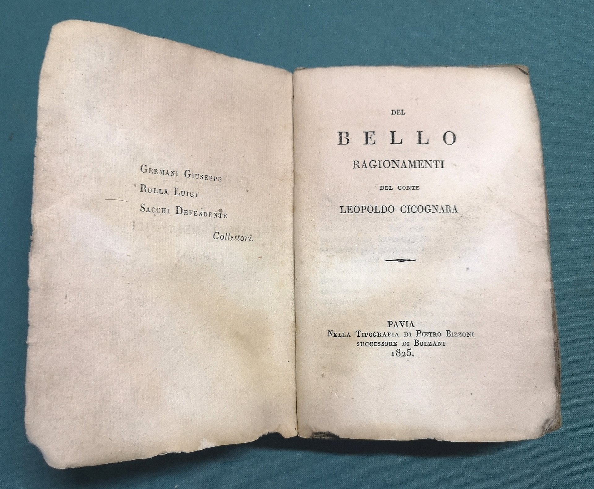>in-24, pp. 385, (3), broch. edit. Seconda edizione, facente parte della Collezione dei Classici Metafisici (Estetica), a cura di Defendente Sacchi. Trattatello di estetica in sette ragionamenti (prima edizione 1808), che ''costituì il primo tentativo compiuto dal C. per strutturare e far convivere nei suoi sette Ragionamenti suggestioni e convinzioni di differente matrice: l'estetica kantiana, l'evoluzionismo illuministico, il pensiero sensista, l'indagine storica e analitica. Centrale la distinzione tra bello assoluto e bello relativo...'' (D.B.It. XXV, pp. 421-5). Discreto esemplare, lievi aloni d'umido marginali. Cicognara 1048 (la I ediz. 1808).
