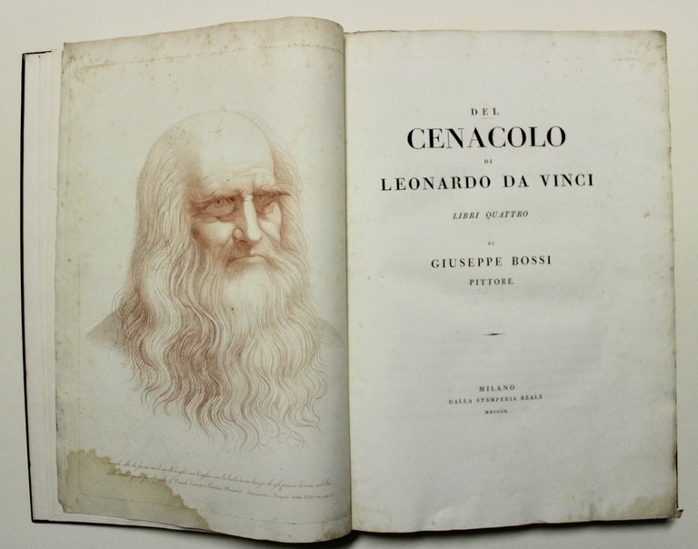 In folio (mm 446x305). Occhiello, pp. 263, (1), con un ritratto di Leonardo all'antiporta in sanguigna e 6 splendide tavv. f.t., alcune tirate in sanguigna, tratte da disegni leonardeschi ed inc. in rame da G. Benaglia e G. Longhi, Francesco Rosaspina, ad ampi margini e parzialmente in barbe; pagg. 8 bianche. Mezzo marocchino rosso dell'inizio del XX secolo, titoli in oro al dorso con cinque nervi. Copia ad ampi margini di questa celebre edizione originale illustrata di argomento leonardesco. Opera fondamentale sulla storiografia di Leonardo e della sua arte, che analizza con rigore e completezza il celebre affresco milanese. Artista poliedrico e raffinato collezionista, Giuseppe Bossi (1777-1815), dopo aver realizzato una replica del Cenacolo per Eugène de Beauharnais, redasse questa monumentale opera, documentando ogni aspetto del dipinto e registrando con precisione gli interventi di restauro subiti nel tempo. Il libro divenne un'opera di riferimento per i viaggiatori europei, contribuendo a rendere la visita al Cenacolo una tappa imprescindibile del Grand Tour tanto che sia Stendhal che Goethe ne possedevano una copia. Quest'opera è frutto di lunghi studi che il Bossi fece sul Cenacolo, quando il Vicerè d'Italia Eugenio Beauharnais di gli commise di eseguirne una copia. Opera certamente importante anche dal lato bibliografico per la vasta menzione degli autori che hanno trattato l'argomento a partire dal Pacioli. Esemplare molto bello, ben conservato, su carta distinta con marca d'acqua. Ottimo esemplare (piccola macchia al margine inferiore delle prime due carte, sporadiche fioriture).<BR>Opera fondamentale sulla storiografia di Leonardo e della sua arte, che analizza con rigore e completezza il celebre affresco milanese. Artista poliedrico e raffinato collezionista, Giuseppe Bossi (1777-1815), dopo aver realizzato una replica del Cenacolo per Eugène de Beauharnais, redasse questa monumentale opera, documentando ogni aspetto del dipinto e registrando con precisione gli interventi di restauro subiti nel tempo. Il libro divenne un'opera di riferimento per i viaggiatori europei, contribuendo a rendere la visita al Cenacolo una tappa imprescindibile del Grand Tour tanto che sia Stendhal che Goethe ne possedevano una copia. Opera certamente importante anche dal lato bibliografico per la vasta menzione degli autori che hanno trattato l'argomento a partire dal Pacioli. Esemplare molto bello, ben conservato, su carta distinta con marca d'acqua, con piccola macchia al margine inferiore delle prime due carte, sporadiche fioriture<BR>Cfr. Predari, p. 426; Brunet, I, 1129; Cicognara, 3373; Parenti "Rarità bibliografiche dell'800", IV, 289/290; Cat. Hoepli, 1192: "monumento mirabile di erudizione e di critica". <BR><BR>