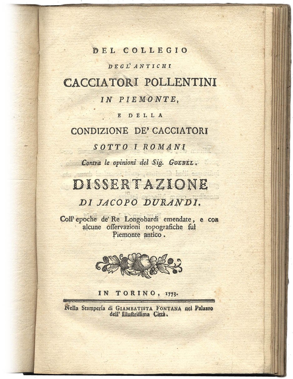 Del Collegio degl'antichi Cacciatori Pollentini in Piemonte, e della condizione de’ cacciatori sotto i Romani. Contro le opinioni del Sig. Goebel. Coll'epoche de' Re Longobardi emendate, e con alcune osservazioni topografiche sul Piemonte antico.