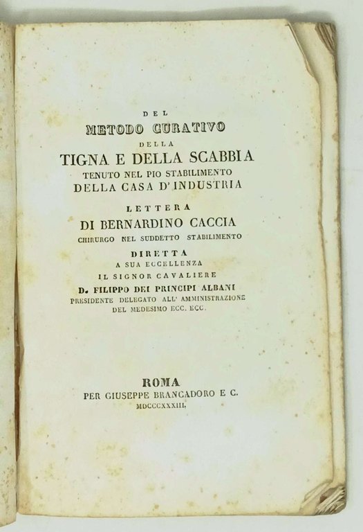 >in-8, (mm 210 x 137), ampi margini, pp. 36, (2), bella brossura editoriale con cornice stilizzata e vignetta al centro di ambedue i piatti. Dedica ms. dell'autore al ''Signor Dottor Cabonary'' al piatto sup. Interessante resoconto in forma di epistola dedicato a Filippo Albani. Il Caccia fu chirurgo nel pio Stabilimento della Casa d'Industria. Buon esemplare.