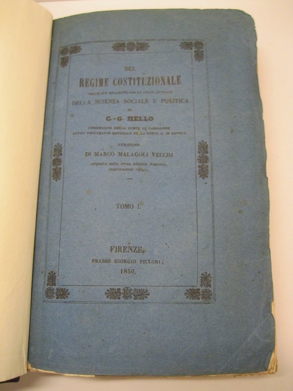 2 voll. leg. in uno, in 8, pp. 338; 298. T. tl. mod. (cons. le br. ed.). Bibl. Einaudi, 2872 (cita l'ed. francese 1849). Prima edizione italiana di questo testo poco conosciuto e di grande interesse. Scritto nel 1827, pubblicato prima del colpo di stato del 1830 e' stato varie volte modificato col succedersi degli avvenimenti politici in Francia. Si tratta delle libeta' individuali, dei culti e della liberta' di stampa, della proprieta', della divisione dei poteri etc.