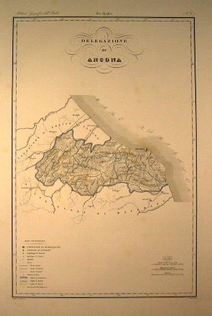 Tratto da ' Atlante geografico dell'Italia ' - Stato Pontificio di G. Pozzi - cm 33 x 52 - - Carta in ottimo stato di conservazione. - Tavola N. 8. Dimensione del foglio 630 mm x 460 mm. Confine di delegazione, di distretto e di Governo acquerellato.