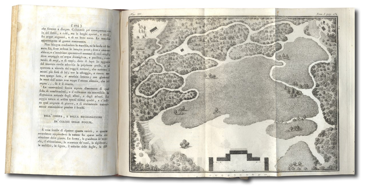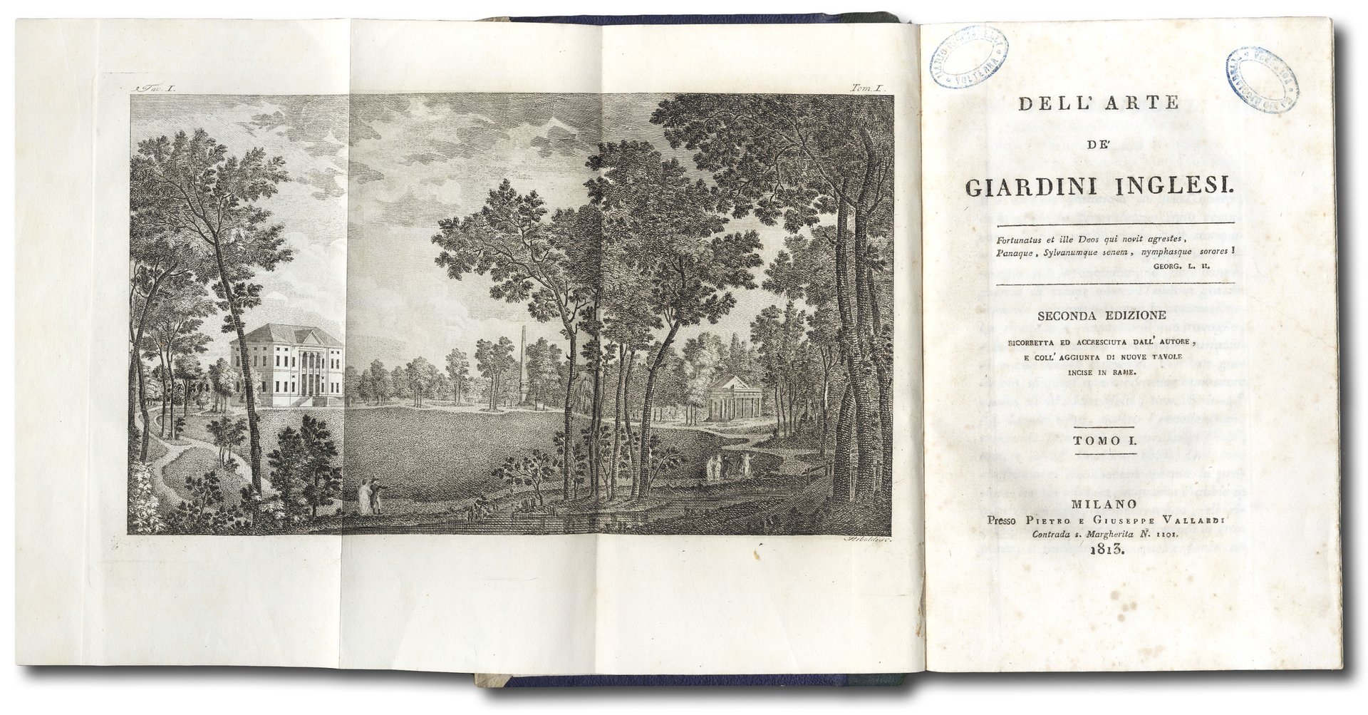 >2 tomi in un vol. in-8, pp. (12), 218, (2); (8), 220 (erron. num. 211), (2); elegante legatura del tempo in m. pelle verde, tit. e ricchi fregi oro al dorso. Seconda edizione (la prima era apparsa nel 1801), ampliata e corredata di 38 tavole (su 40 mancando per difetto di origine due tavole piccole, la n. 9 e la n. 32) f.t. inc. da Riboldi, alcune delle quali ripieg. e raffiguranti giardini e parchi di fantasia o reali (come ad esempio la veduta dei giardini della ''Villa Bonaparte in Milano''). L'opera ebbe notevole importanza per la diffusione dell'arte del ''landscape garden'' in Italia e dei giardini all'inglese, una ''particolare forma di ''landscaping'' che prevedeva una serie di complementi architettonici (tempietti, torrette, false rovine, coffee-houses ed altro)'' (dal ''Il Gran Teatro delle Fabbriche, a cura di Paliaga e Valeriani, Milano 2000). Ottimo esempl. Melzi I, p. 190. Cicognara 960. Schlosser-Magnino p. 684: ''la più importante opera italiana sull'argomento''.