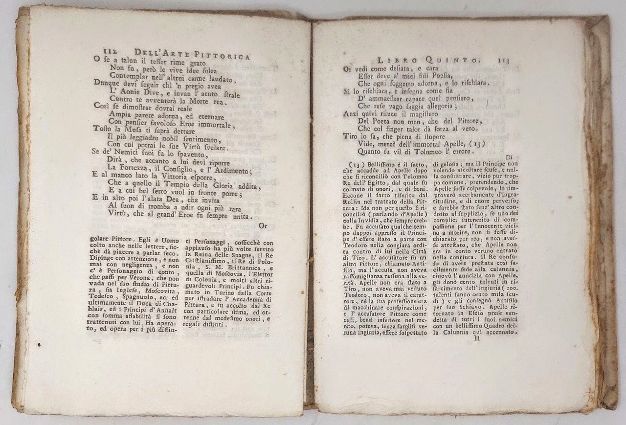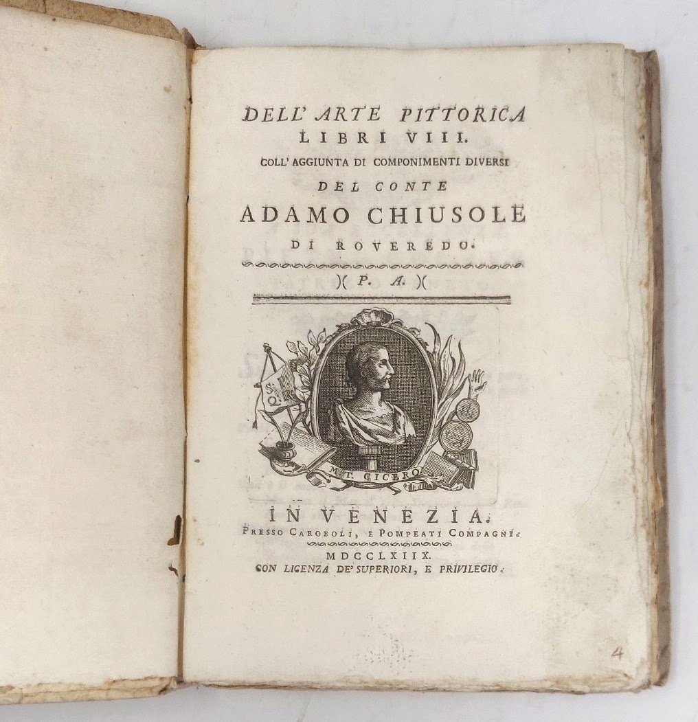 >in-8, pp. 296, leg. coeva cart., tit. ms. al dorso. Vignetta inc. al tit., deliziose testatine inc. in rame, finaletti ed iniz. silogr. Prima e unica edizione di questo poema letterario-artistico-didascalico in terzine sulla pittura, con sezioni separate sul disegno, il colore, la prospettiva, l'inventiva, lo stile, ecc., corredato di ampie note, indici degli artisti citati e scuole pittoriche; seguono ''Componimenti diversi del medesimo autore'' tra i quali spiccano il ''Componimento drammatico sopra la pittura'' (a pag. 257) e le cantate ''La scultura'' e ''La pittura'' (pp. 272-5). Comprende pure un sonetto indirizzato al console Smith, il famoso sponsor del settecento veneto. Il conte Chiusole (Rovereto 1728-1787) fu letterato, storico e pittore, allievo di Pompeo Batoni. Perfetto esemplare. Raro. Schlosser Magnino p. 683. Cicognara n. 978.