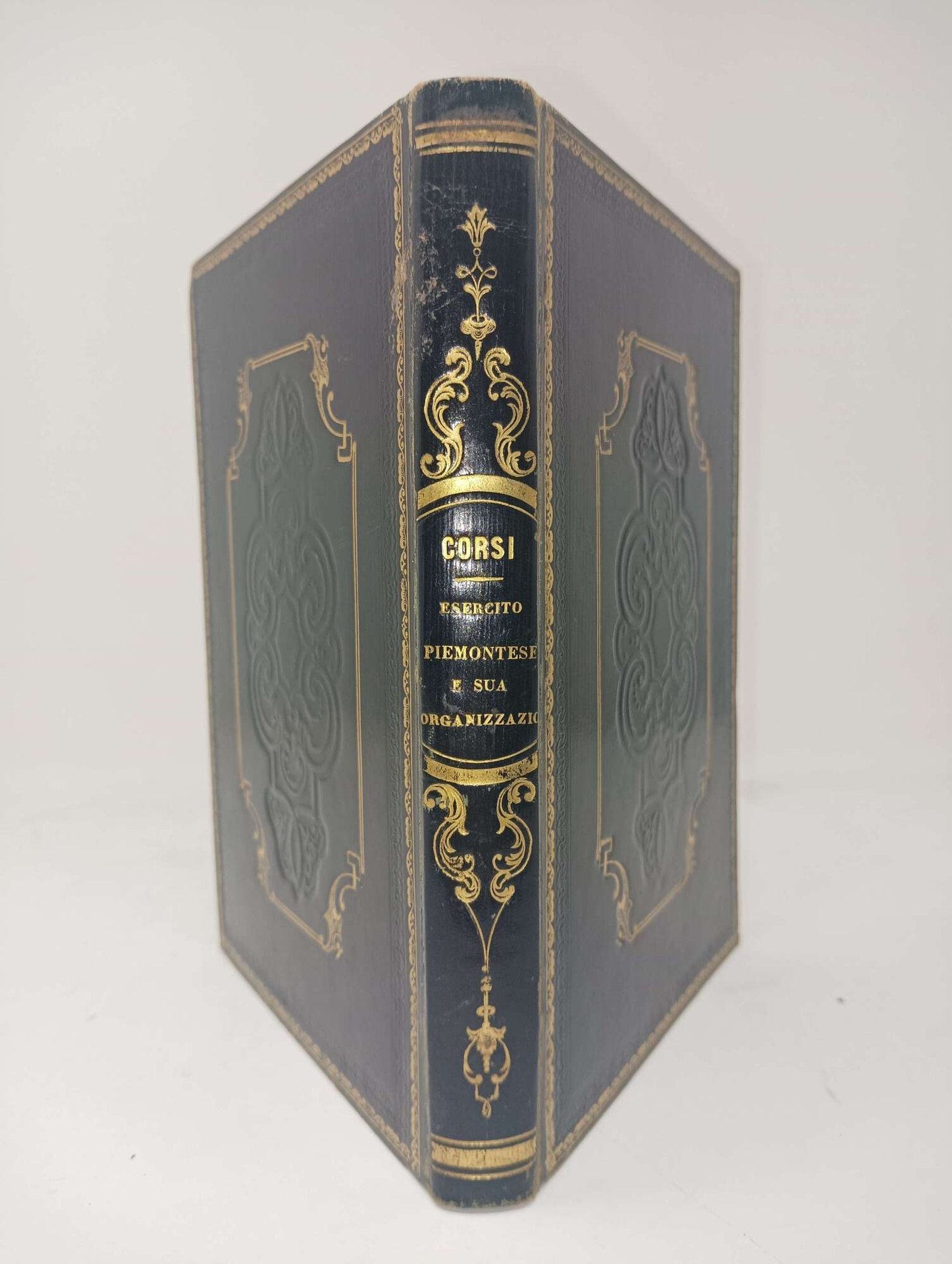 >in-16 (mm 200x140), pp. (6), 290, deliziosa leg. romantica in p. pelle nera con duplice bordura sui piatti, a secco ed in oro, al centro dei medesimi fleuron impresso a secco racchiuso in altra bordura oro, tit. ed eleganti fregi oro al dorso, tagli dor. Prima edizione di questo studio storico esaustivo sulle forze militari piemontesi. Molto raro. Stupendo esemplare. Manno-Promis I, 4090.