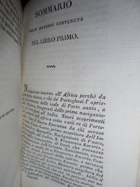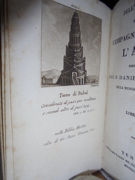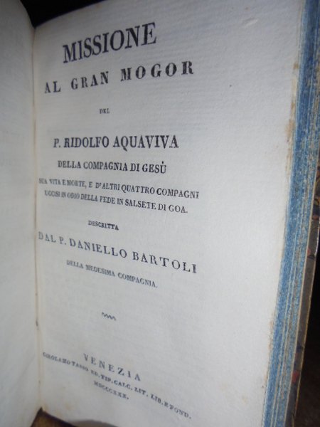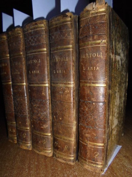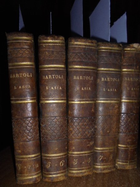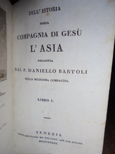 P. Daniello, Bartoli. Venezia, Girolamo Tasso, MDCCCXXX (1830). Dell' Istoria della Compagnia di Gesù. L' ASIA. 5 volumi in-16°, m. pelle coeva con fregi e titoli in oro nei dorsi. Libri 10 in 5 volumi: Vol. 1.2. 192, (4) pp. compresa una illustrazione in antiporta incisa in rame da Lazzari raffigurante Torre di Babel. Libro secondo: 165 pp., 2 f. b.; Vol. 3.4. 230. Libro IV: 193 pp. 1 f. bianco. Vol. 5.6. 190 pp. Libro VI: 191 pp., 1 f. bianco. Vol. 7.8. 192 pp. Libro VIII parte prima: 189 pp. 2 ff. bianchi. Libro VIII parte seconda: 183, (8) pp. Missione al Gran Mogor: 175 pp., 1 f. bianco. Opera completa riguardante le missioni dei Gesuiti in Asia. Neg. esot. mob. 100