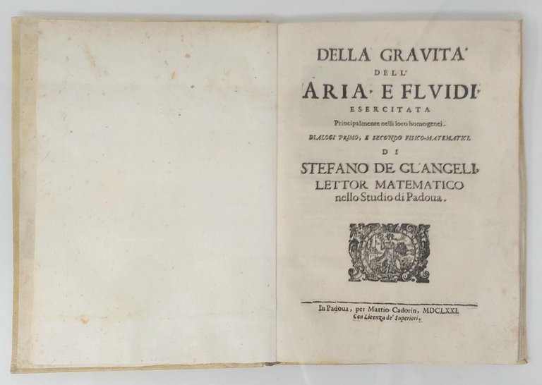 Della gravità dell'aria e fluidi esercitata principalmente nelli lor homogenei. Dialogi Primo, e Secondo fisico-matematici. (Segue il secondo volume:) Dialogi Terzo, Quarto, e Quinto. Di Stefano Del Angeli Lottor Matematico nel studio a Padova.