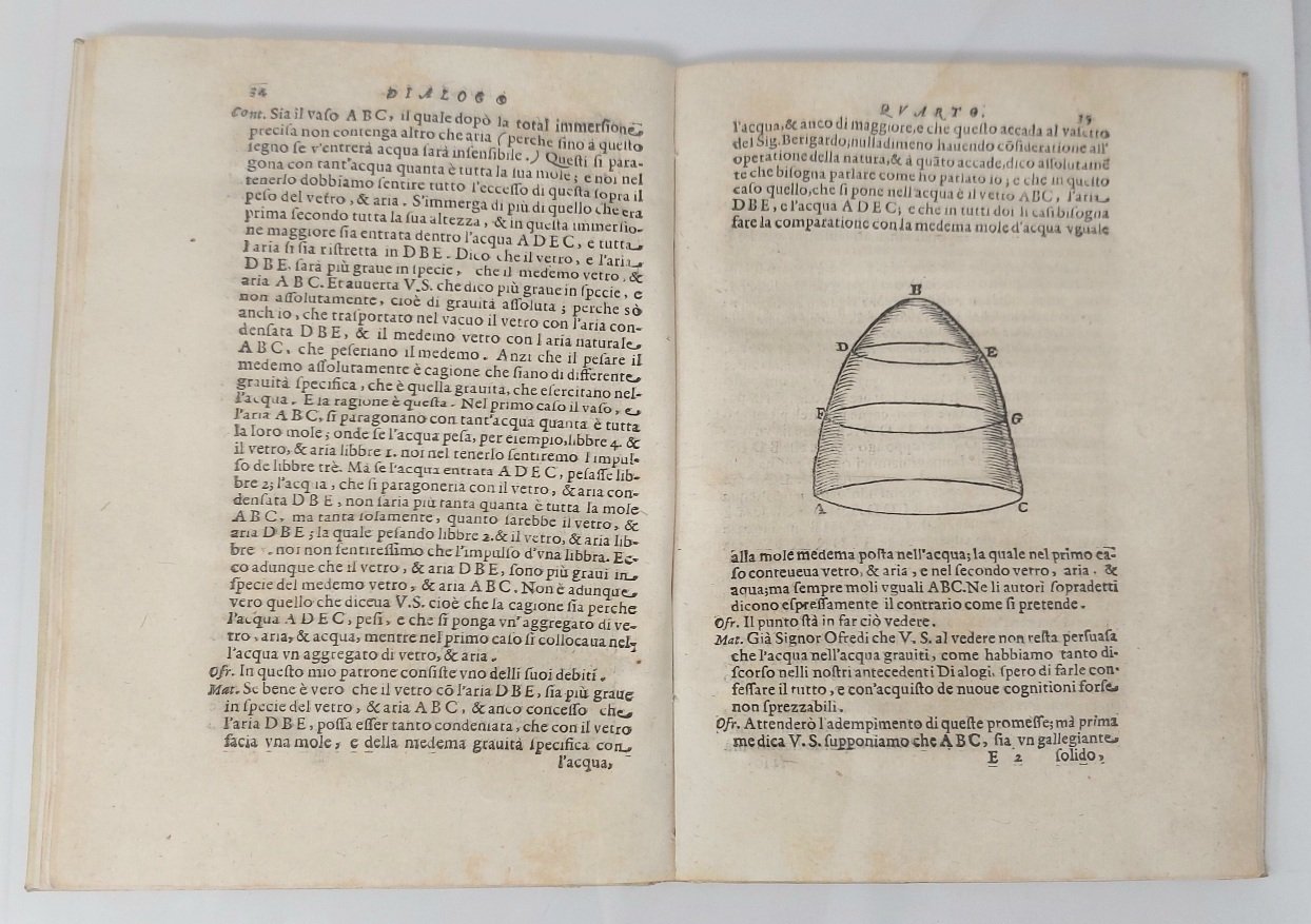 >2 vol. in-4 (mm 216x154-156), pp. (4), 79, (1 bianca); (8, le prime 2 bianche), 96. Legature posteriori in piena pergamena, leggermente difformi. Impresa tipografica sui due titoli, varie figure nel testo, iniziali istoriate, fregi e diagrammi in silografia. Il secondo volume è dedicato al marchese Francesco Maria Riario. Prima rara edizione di un'importante opera sulla fisica dei fluidi, qui completa delle cinque parti, redatte, come già le "Considerationi", in forma di dialogo tra il conte polacco Leszczynsky, un certo Ofredi anch'egli straniero e un matematico, che impersona l'autore stesso. Ampiamente basata sul metodo sperimentale, porta nuove prove alle teorie di Torricelli; contiene inoltre teorie sull'attrazione capillare. "L'opera ha un carattere largamente sperimentale, in cui si esamina la statica dei fluidi, basata sul principio di Archimede e sugli esperimenti del Torricelli... Nei lavori di fisica dell'Angeli ci sono molti riferimenti alla meccanica galileiana, e anche la sua accettazione e uso del metodo sperimentale" (DSB I, 164-5). Stefano degli Angeli (Venezia 1623 - Padova 1697), gesuita e poi prete secolare, fu illustre geometra e matematico, confratello e collaboratore di Bonaventura Cavalieri a Bologna e dal 1662 sino alla morte insegnante sulla cattedra di matematica dello Studio di Padova che era stata di G. Galilei, di cui fu tra i primi a seguirne le teorie. Ottimo esemplare. DSB I, 164-165. CARLI-FAVARO, Bibl. galileiana, 331, 333. RICCARDI I (I), 36; POGGENDORFF, I, 46-47.