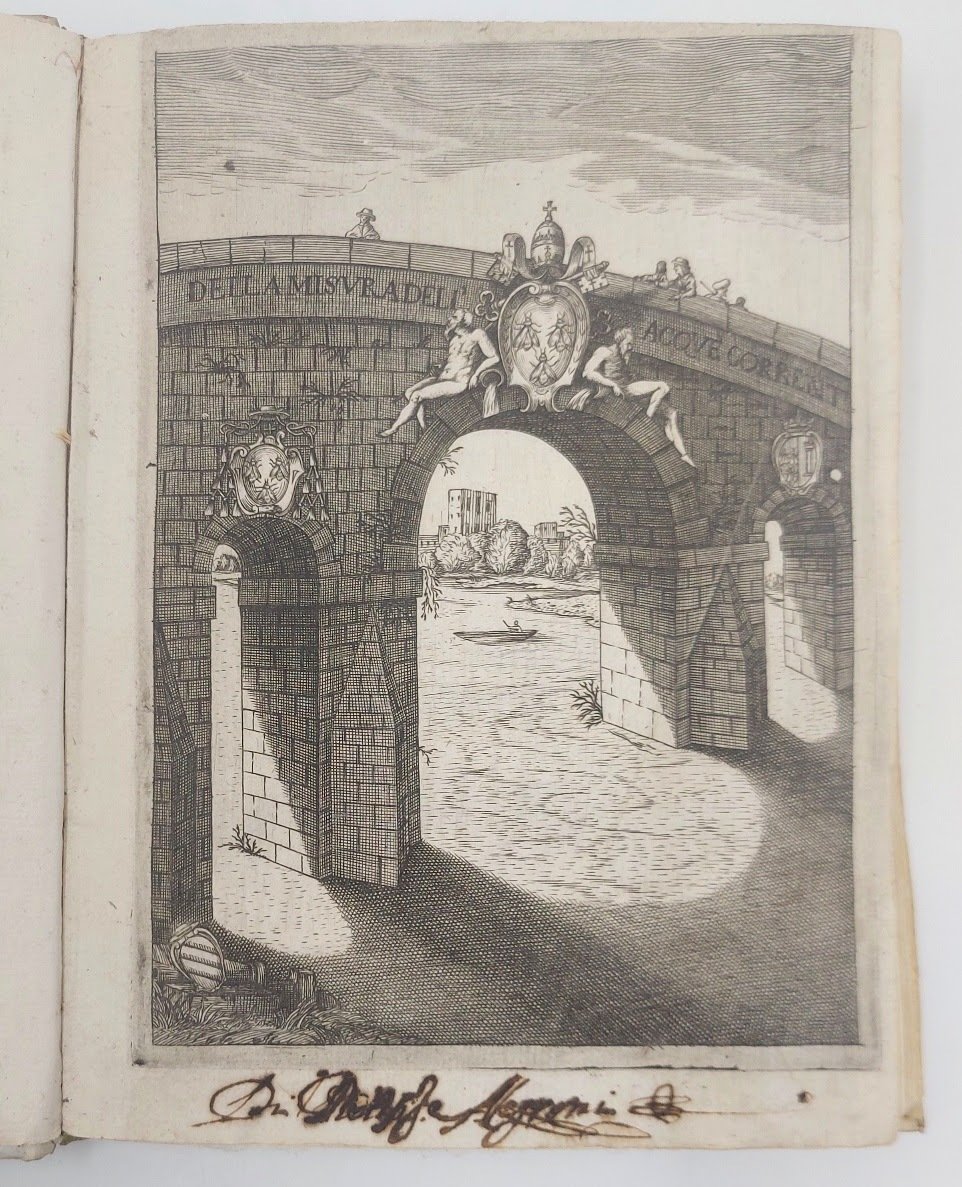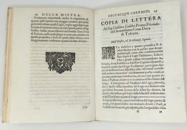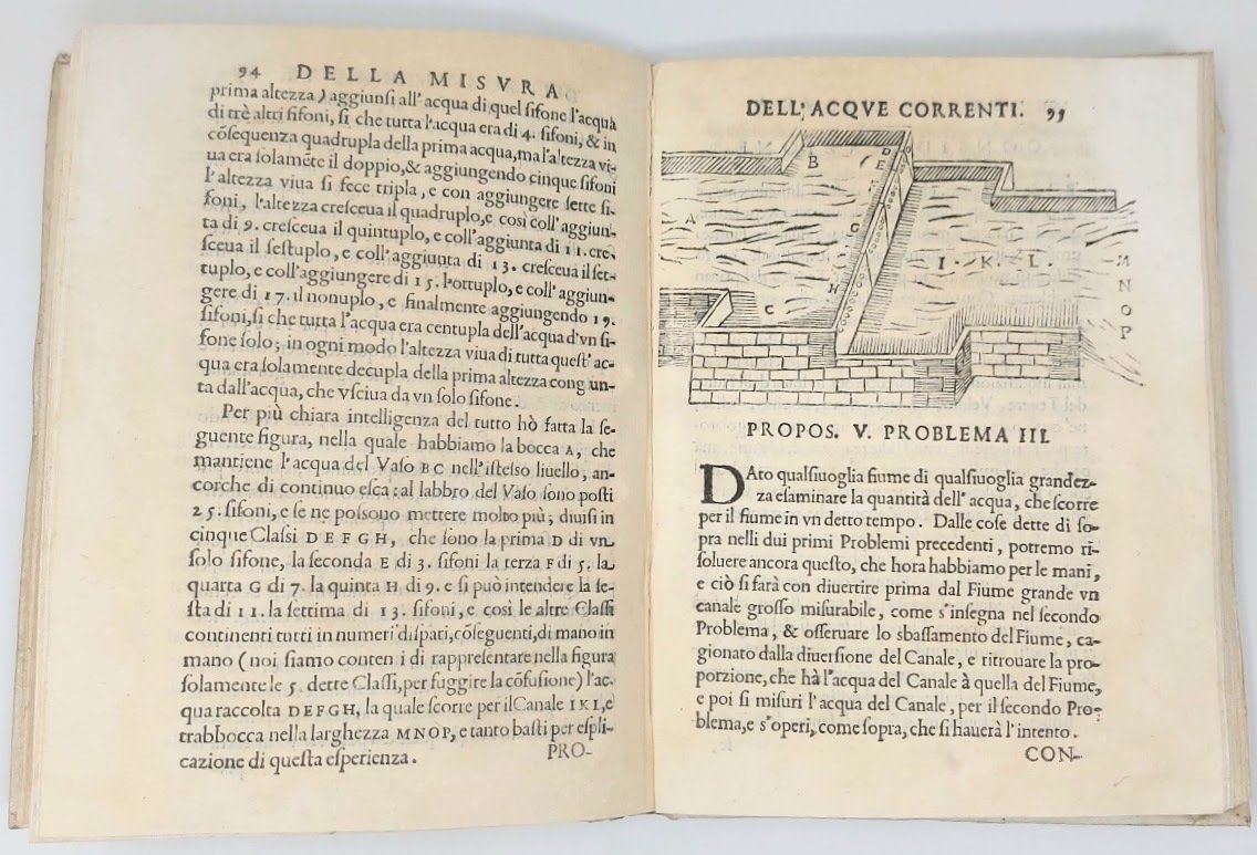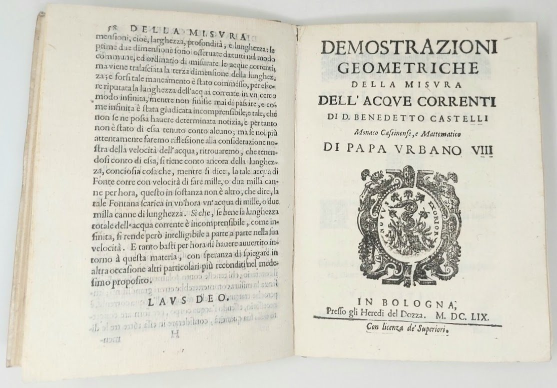 >2 parti in un volume in-4, pp. (20, compr. antip.), 184, legatura coeva in pergamena, vignette ai frontespizi di entrambe le parti, iniziali ornate, testatine e finalini in xilografia. . Precedono il testo ''Dedica'', ''Avviso'' ai lettori di Carlo Manolessi, curatore dell'ediz., e un copioso ''Indice''. Antiporta incisa, figure geometriche ed una figura di chiuse in xilografia n.t. Le ''Demostrazioni geometriche'' hanno frontespizio. proprio, compreso nella numeraz. delle pag. e data 1659. Terza edizione, in parte originale (dopo la prima del 1628 e la seconda del 1639). Come dichiara il Manolessi sia nella dedica che nell'avviso al lettore, compaiono qui per la prima volta il secondo libro (che inizia a pag. 76), comprendente anche la ''Considerazione intorno alla laguna di Venezia'' e la ''Considerazione sopra la bonifica del Bolognese, Ferrarese, e Romagnola'' (pp. 152-176), oltre la lettera a Mons. Ferrante Cesarini scritta dal Castelli nel 1639. Nella prima parte è invece inclusa la lettera scritta dall'Autore "Al Sig. Galileo Galilei Primo filosofo del Serenissimo Duca di Toscana", relativamente a delle due considerazioni sul Lago Trasimeno, sul quale si erano già scambiati missive. Bell'esemplare (firma di proprietà cassata nel margine dell'antiporta, e al titolo dove compare anche antico timbro con stemma cardinalizio). Riccardi I, 290. Gamba 1845. Graesse II, 64. Brunet I, 1625. Cinti Bibl Galileo, 137.