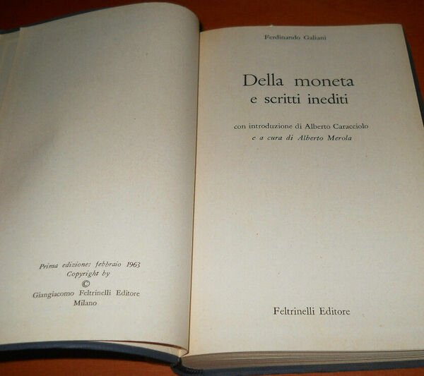 FERDINANDO GALIANI, Della moneta e scritti inediti - Feltrinelli, I ed. 1963 - copertina morbida con sovracopertina in acetato trasparente, formato cm 12 x 17, pag. 421 - eccellente stato generale per le pagine, leggeri segni tempo esternamente