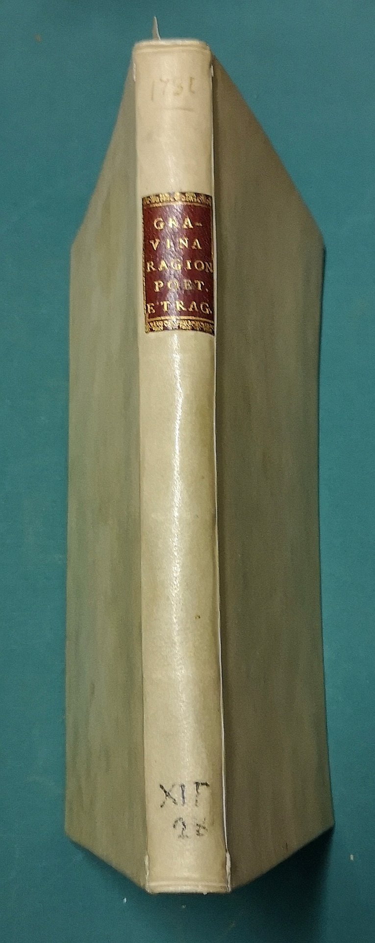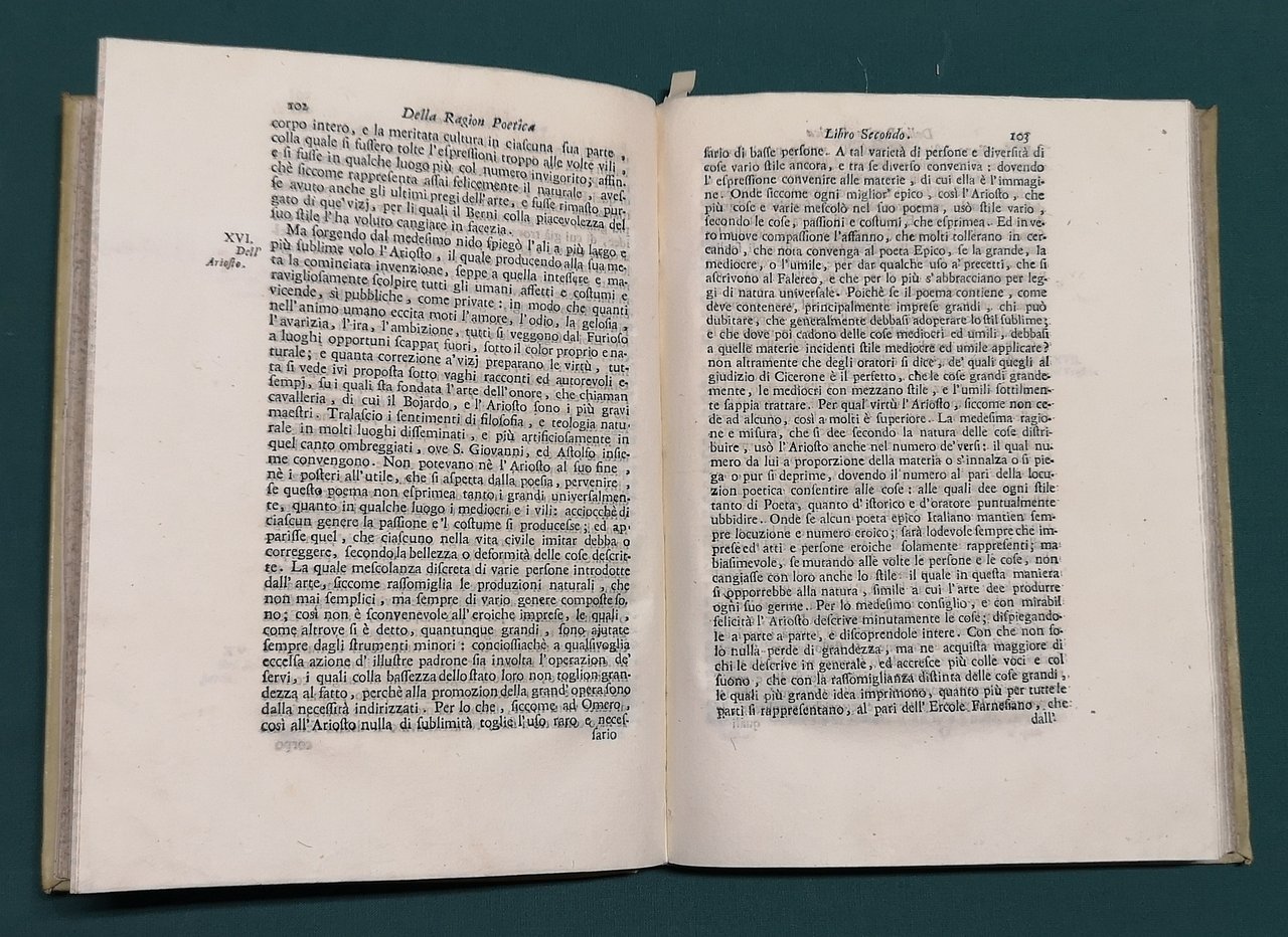 >2 opere in un vol. in-4, pp. (4), 120; (14), 122, (4, le ultime 2 di cat. editor.); leg. pergamena, titolo in oro su tassello al dorso. Nella prima opera, apparsa a Roma nel 1708 e considerata la più importante dell'autore (il Gioberti affermò che l'Italia doveva stimarsi orgogliosa di questo trattato), il Gravina ''tenta di definire la conoscenza fantastica come l'insostituibile momento primitivo della conoscenza: qui egli rivaluta l'allora incompresa poesia di Dante...'' (cfr. Diz. Bompiani, Autori, II, 145). Per il trattato ''Della tragedia'' vedi scheda precedente. Esempl. su carta forte, a pieni margini (alone d'umido nella parte infer. della seconda opera). Renda-Operti p. 580-1.