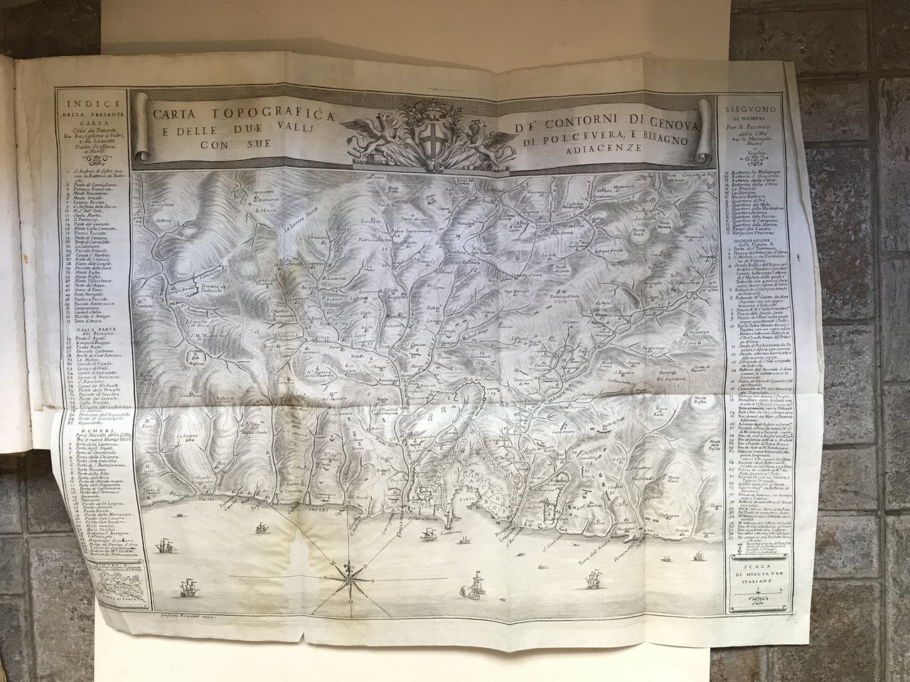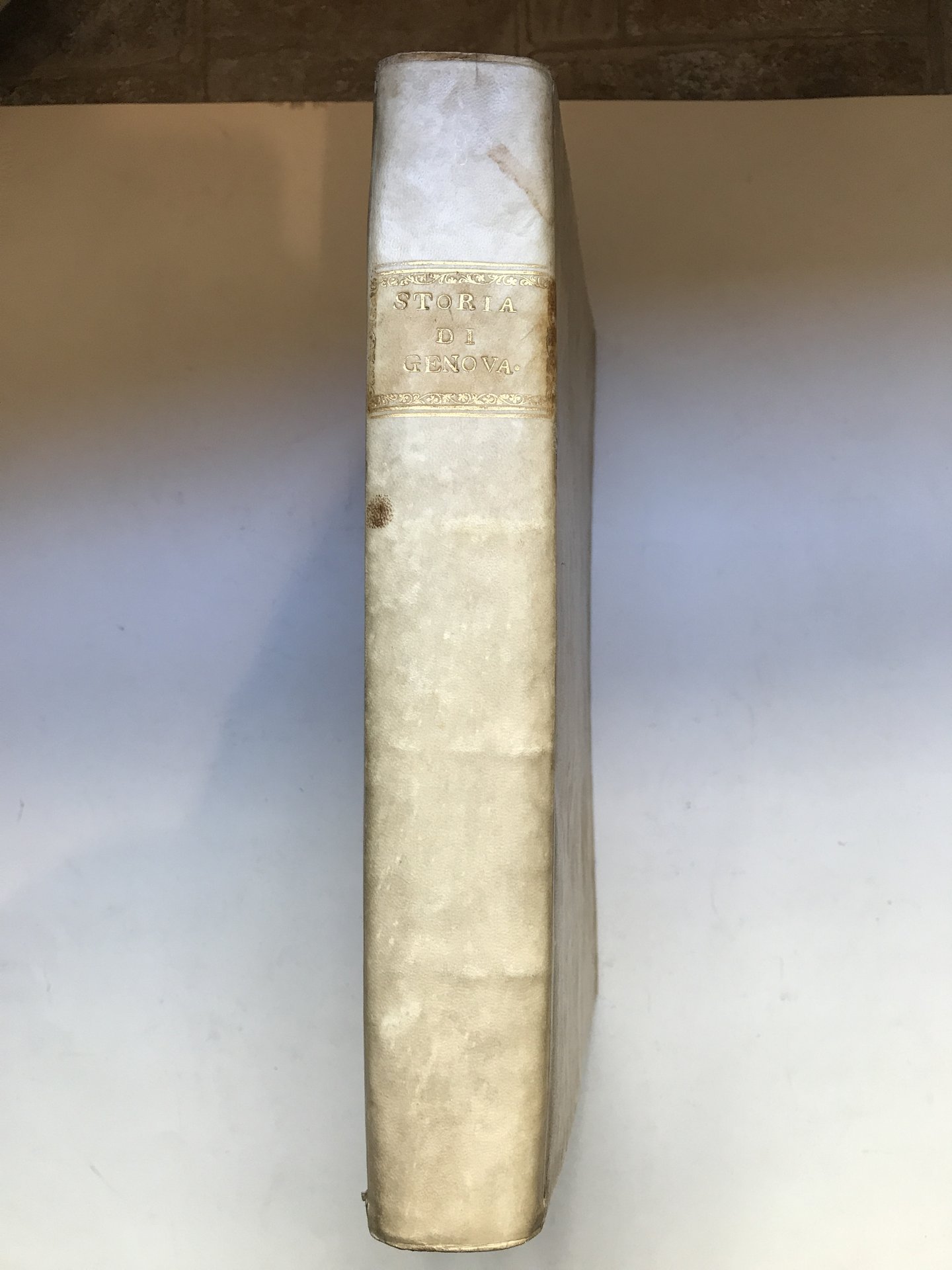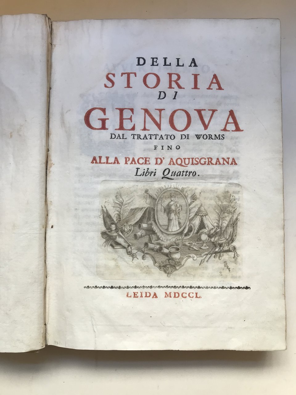 In-4°, pp. (2), 563, (1)., frontespizio in rosso nero con grande vignetta incisa, una grande carta topografica più volte rip. 'De' contorni di Genova e delle due valli di Polcevera, e Bisagno con sue adiacenze' incisa da Giuseppe Benedetti, legatura coeva in piena pergamena con titolo in oro su tassello al dorso. Tagli marezzati. La grande carta presenta una lieve gora e un piccolo strappo senza mancanze alla parte inferiore. Seconda edizione aumentata del quarto libro relativo agli accadimenti degli anni 1748 e 1749. Impressa dal modenese Soliani con la falsa data di Leida. Dobbiamo a Marcello Staglieno l'individuazione dell'ignoto autore di questa monografia (Giornale Ligustico di Archeologia, Arte e Storia, An. IX, Fasc. 1--2, 1834, pag. 401 e passim), il quale corresse così un'errata attribuzione di paternità riconducente al plenipotenziario Francesco Maria Doria fatta dall'Accinelli, condivisa dallo Spotorno e sostenuta fino a tempi recenti anche dal Melzi. I carteggi muratoriani rivelano oggi il piano e il calendario dell'opera, illustrati epistolarmente dal nostro autore al grande bibliotecario modenese. Fu quest'ultimo a far stampare l'opera dal Soliani, impiegando in parte le risme di carta inutilizzate per la stampa delle sua 'Antichità'. Bibliografia: Lozzi, 1340. Spotorno, V, p. 64. Melzi, III, 109. Manno, 22466.