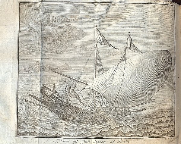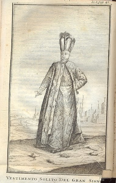 In 16°, p. perg., cc.nn. 7 + pp. 671. Il volume è arricchito da 3 carte geografiche, più volte ripiegate, e 14 inc. a doppia pagina, raffiguranti panorami di città, costumi, monumenti. Antip. con inc. a tutta pag. Tagli spruzzati rossi. Finaline. Testatina. Menda al front. mancante di lembo. Lievissime gore su poche pp. Piccoli strappi alle carte geografiche. L'inc. raffigurante la città di Smirne è mancante della parte finale. Leggermente stanco. Collazionato. Rara ed importante opera, nel complesso in condizioni molto buone.