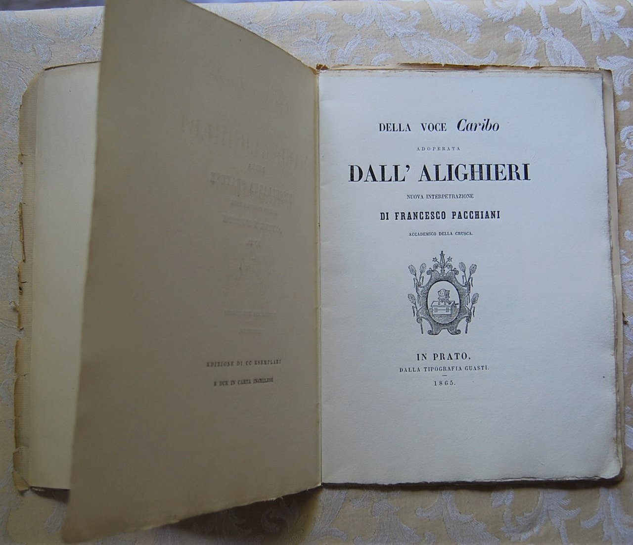 DELLA VOCE CARIBO ADOPERATA DALL'ALIGHIERI. NUOVA INTERPRETAZIONE DI FRANCESCO PACCHIANI ACCADEMICO DELLA CRUSCA. MISCELLANEA PRATESE DI COSE INEDITE O RARE, ANTICHE E MODERNE.