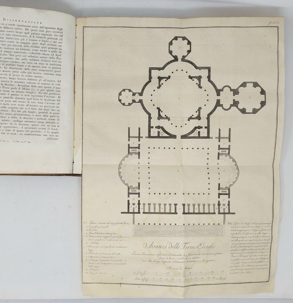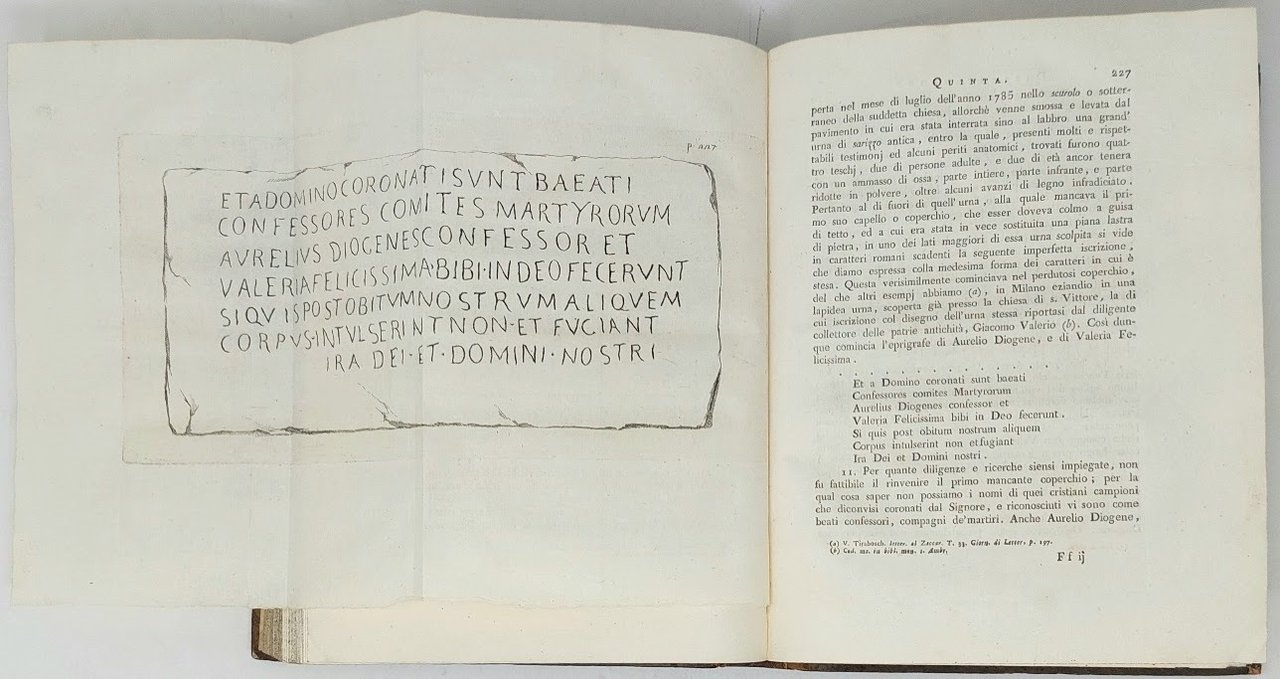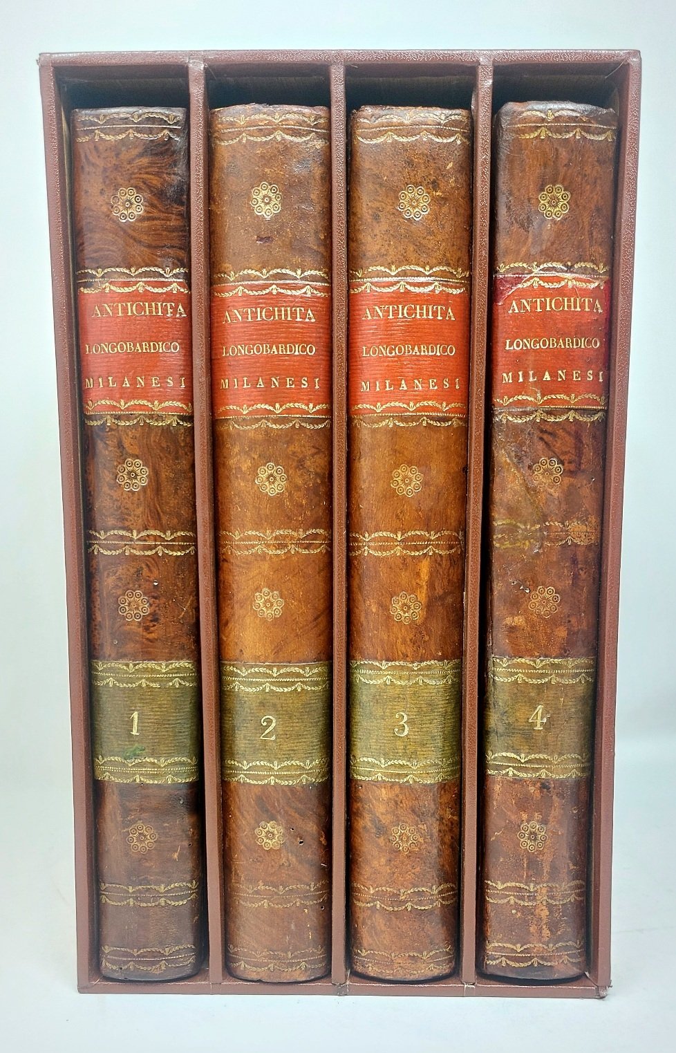 >4 vol. in-4 (mm.282x220), pp. (4), XII, 364; VIII, 407; (2), XII, 424; XVI, 407; bella leg. del tempo m. pelle, duplice tass. con tit. e fregi oro ai dors, tagli marmorizzati. Opera adorna di varie testate inc. in rame e in legno, finalini e 6 tav. inc. f.t. (di cui 5 più volte ripieg.). Poderosa opera, la più importante del Fumagalli (nato a Milano nel 1728 ed ivi morto nel 1804, abate prima di S. Ambrogio e poi di Chiaravalle, tra i più grandi storici e diplomatisti del XVIII sec.). Essa si compone di 40 ampie dissertazioni, condotte sui documenti, e concernenti le leggi, le consuetudini, i costumi dei Longobardi, gli antichi edifici, lo stato del commercio e dell'agricoltura in quell'età, ecc. («Dissertazioni di vario, ed alcune di nuovo argomento, altre civili ed altre ecclesiastiche, le quali riguardano le antichità dei secoli di mezzo, di cui assai scarse sono le memorie, e queste non di rado o inesatte o false o contraddittorie...Ovunque si farà uso delle regole d'una rigorosa critica...», dalla prefaz.). Magnifico esemplare impresso su carta forte, assai fresco. Predari 148. Cat. Hoepli 693. Cat. Meneghina 1015. Cicognara: «Opera piena di erudizione e di dottrina». Lozzi 2633, note.