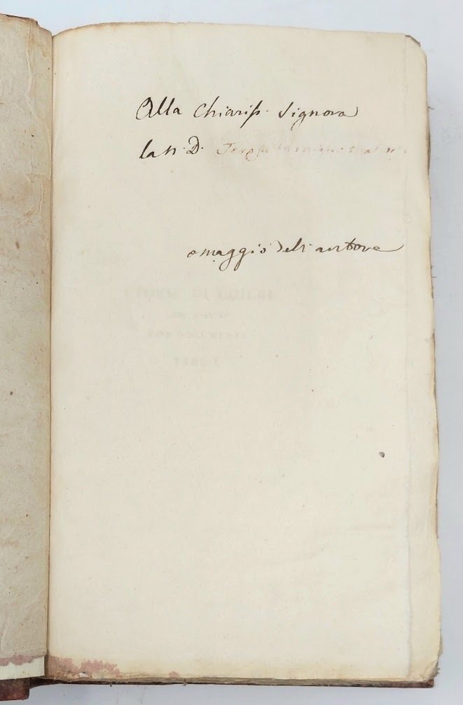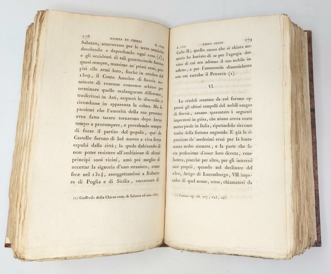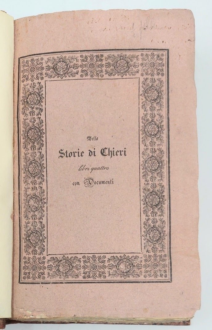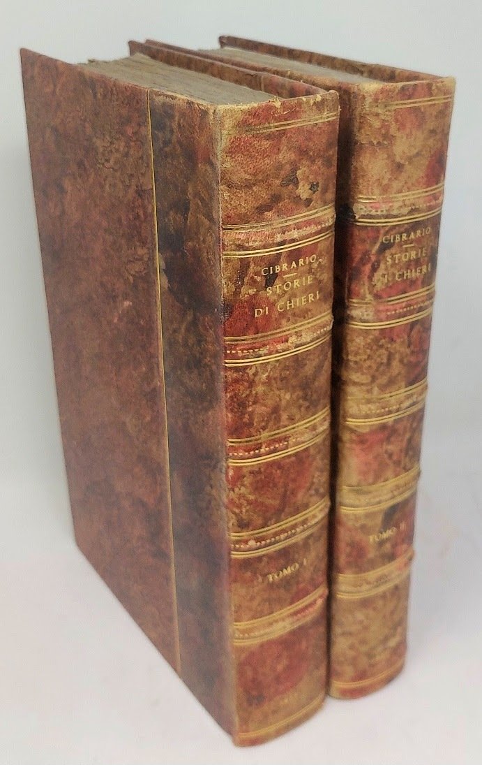 >2 vol. in-8, pp. XI, (3), 593, (1); XIIII, (1), 453; ben leg. m. pelle marmorizzata con titolo oro su dorso a nervetti, cop. edit. cons. Dedica autografa dell'autore ad entrambi i voll. (cancellato il nome della dedicataria). Prima edizione di questa rara e fondamentale storia della città di Chieri. Il primo vol. contiene le storie, il secondo i documenti. Ottimo esemplare a margini pieni. Manno IV, 17838. Platner 103. Lozzi I, 1220, note.